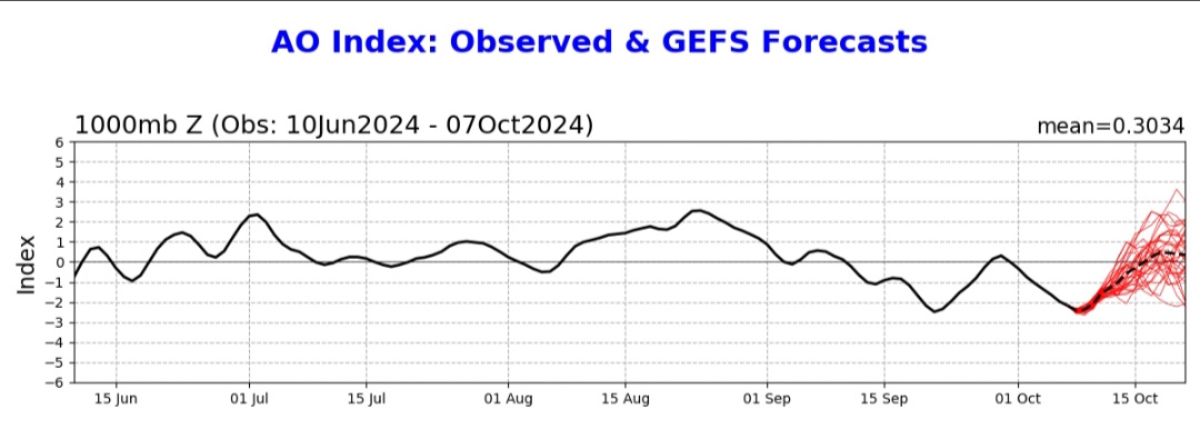 Un altro indicatore chiave da monitorare è l’Oscillazione Artica (AO), un indice che misura le differenze di pressione tra le regioni polari e quelle a latitudini più basse. Quando l’AO è positivo, come previsto per le prossime settimane, si verificano condizioni di alta pressione alle medie latitudini e di bassa pressione nelle regioni polari. Questo rafforza il Vortice Polare, limitando la possibilità che l’aria fredda si spinga verso sud.
