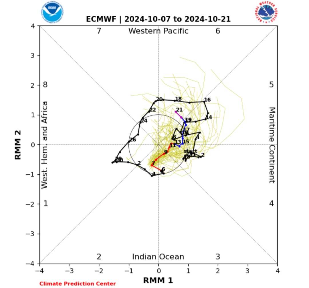 Un ulteriore fenomeno che potrebbe influenzare il clima nei prossimi mesi è la Madden Julian Oscillation (MJO), una oscillazione atmosferica che si sviluppa nelle regioni tropicali e ha effetti su larga scala, influenzando anche le latitudini più alte. Attualmente, le previsioni indicano che la MJO potrebbe entrare nella fase 6 nelle prossime settimane. Questa fase è nota per la sua capacità di influenzare il Vortice Polare, favorendo la formazione di blocchi anticiclonici.