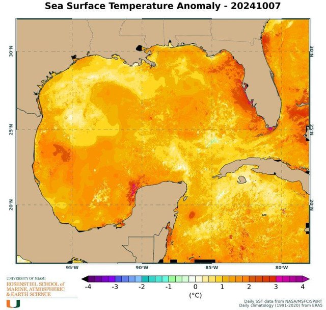 L’intero Golfo del Messico è estremamente caldo, ma alcune delle acque più calde si trovano dove Milton ha rapidamente intensificato la sua forza ieri e vicino alla costa occidentale della Florida, dove infine toccherà terra. Le acque vicino alla costa della Florida sono tra 2 e 3 gradi Celsius più calde di quanto dovrebbero essere in questo periodo dell’anno, secondo l’esperto di uragani Brian McNoldy.