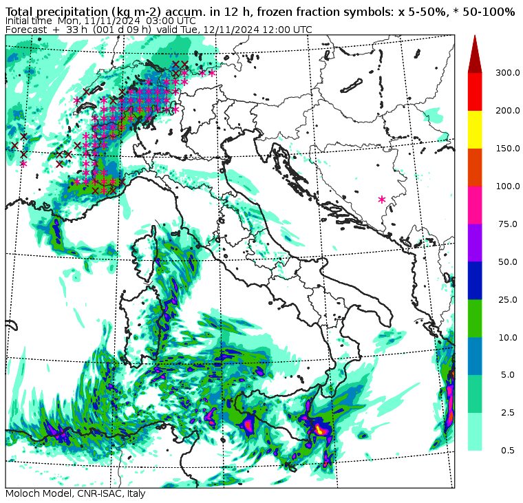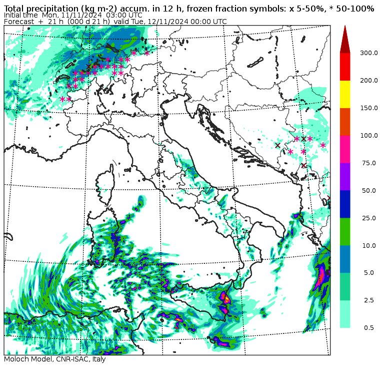 Il maltempo continuerà anche domani, martedì 12 novembre, con temporali violentissimi tra Sardegna e Sicilia. I fenomeni più estremi continueranno a colpire la Sicilia orientale, con oltre 200mm di pioggia a Siracusa nella notte. Anche la città aretusea rischia una pesante alluvione. Attenzione, sempre per domani, alla neve al Nord/Ovest: abbiamo già pubblicato le previsioni meteo per il Piemonte, ma anche in Valle d’Aosta nevicherà a quote basse come conferma Moloch: