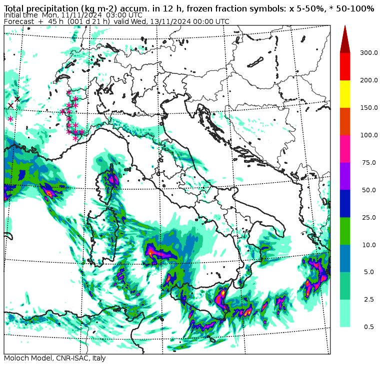 Le mappe del modello Moloch del CNR-ISAC evidenziano una vera e propria degenerazione del maltempo nelle prossime ore. Per il pomeriggio-sera di oggi, infatti, sono previsti veri e propri nubifragi nei settori orientali della Sicilia, con oltre 200mm di pioggia su Catania che rischia una pesante alluvione. Forti piogge e temporali anche nella Sicilia sud/orientale, occidentale e in Sardegna, oltre che a Malta: