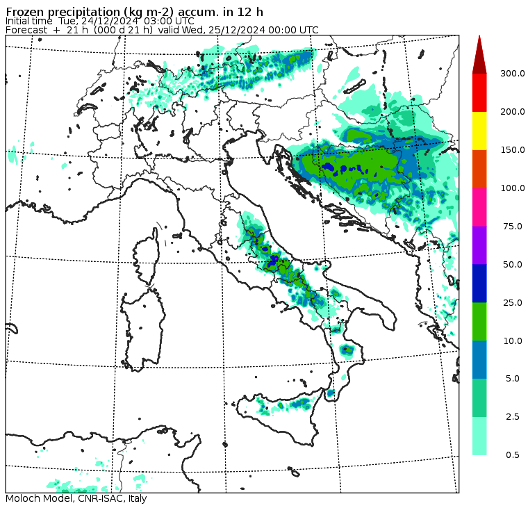 Intanto al Centro/Sud continua a nevicare copiosamente fino a quote molto basse, e continuerà ancora non solo per tutta la giornata odierna ma anche – seppur in modo via via sempre più attenuato – nel giorno di Natale, domani, mercoledì 25 dicembre. Le zone più colpite sempre nel versante Adriatico centro/meridionale e al Sud: