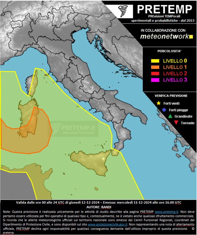 “La presenza di un cut-off in quota associato ad aria ancora alquanto fredda, chiuso sulla Penisola Iberica, cui corrisponderà al suolo un minimo depressionario centrato in prossimità delle coste algerine, disporrà un flusso di correnti sud-occidentali in media e alta troposfera associate ad un’area ad elevata diffluenza tra il Canale di Sardegna e il Canale di Sicilia, cui corrisponderanno nei bassi strati correnti miti e umide da Est o Est-Sud-Est,” spiega PRETEMP. “Si è attribuito un livello di pericolosità 1 per piogge eccessive sul Canale di Sardegna e tra la Sardegna meridionale e quella orientale, mentre un livello 0 varrà per trombe marine, principalmente sul mare ma occasionalmente anche lungo le coste e isolate grandinate di piccole dimensioni. Sulle altre aree indicate varrà un livello 0 per i medesimi parametri“.