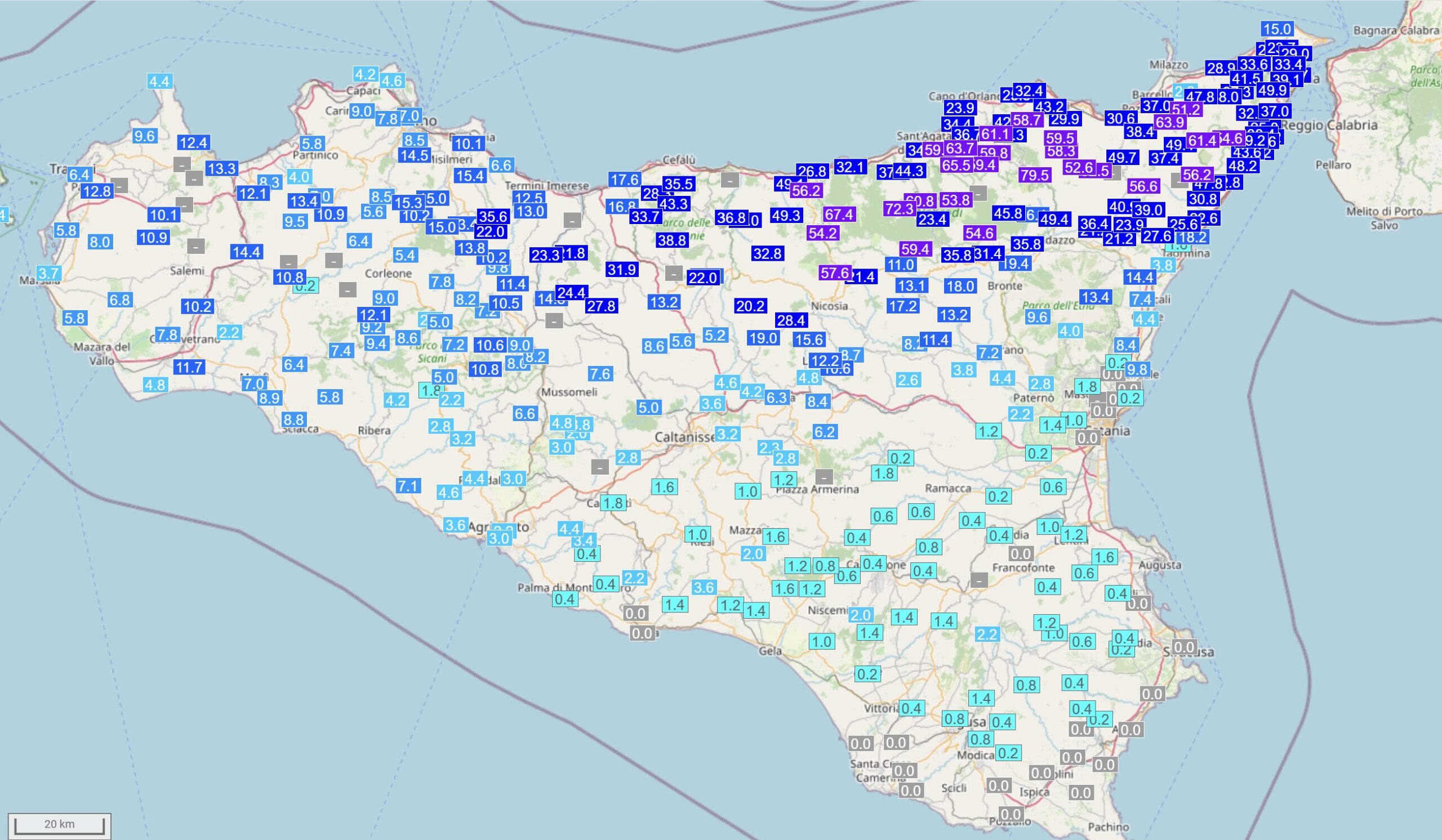 Sempre sui Nebrodi, 66mm a Alcara Li Fusi e 64mm a San Marco d’Alunzio. Nel palermitano spiccano i 43mm di pioggia a Isnello, 36mm a Ventimiglia di Sicilia e a Gibilmanna, 34mm a Collesano e 32mm a Fondachello a Caltavuturo, ma anche stavolta è notevole l’estensione delle precipitazioni che sono diffuse su tutto il territorio regionale, come già accaduto nelle numerose e recenti ondate di maltempo che hanno colpito l’isola.