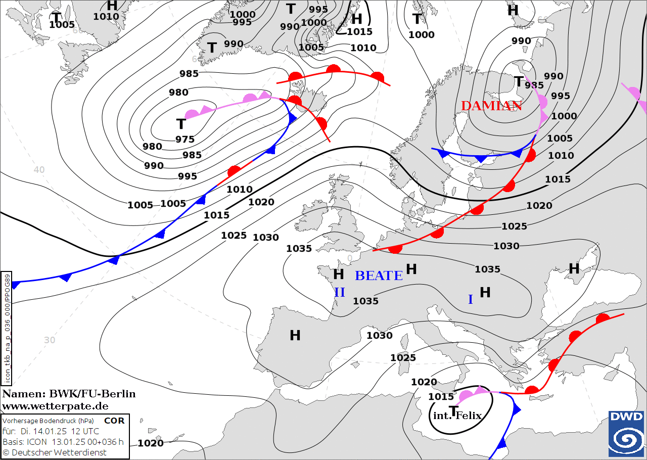 Il Ciclone Polare, attualmente denominato Felix, persisterà sempre tra mar Jonio e Canale di Sicilia anche domani, martedì 14 gennaio, mentre un poderoso Anticiclone occuperà il territorio dell’Europa centrale con massimi vicini ai 1040hPa di alta pressione.