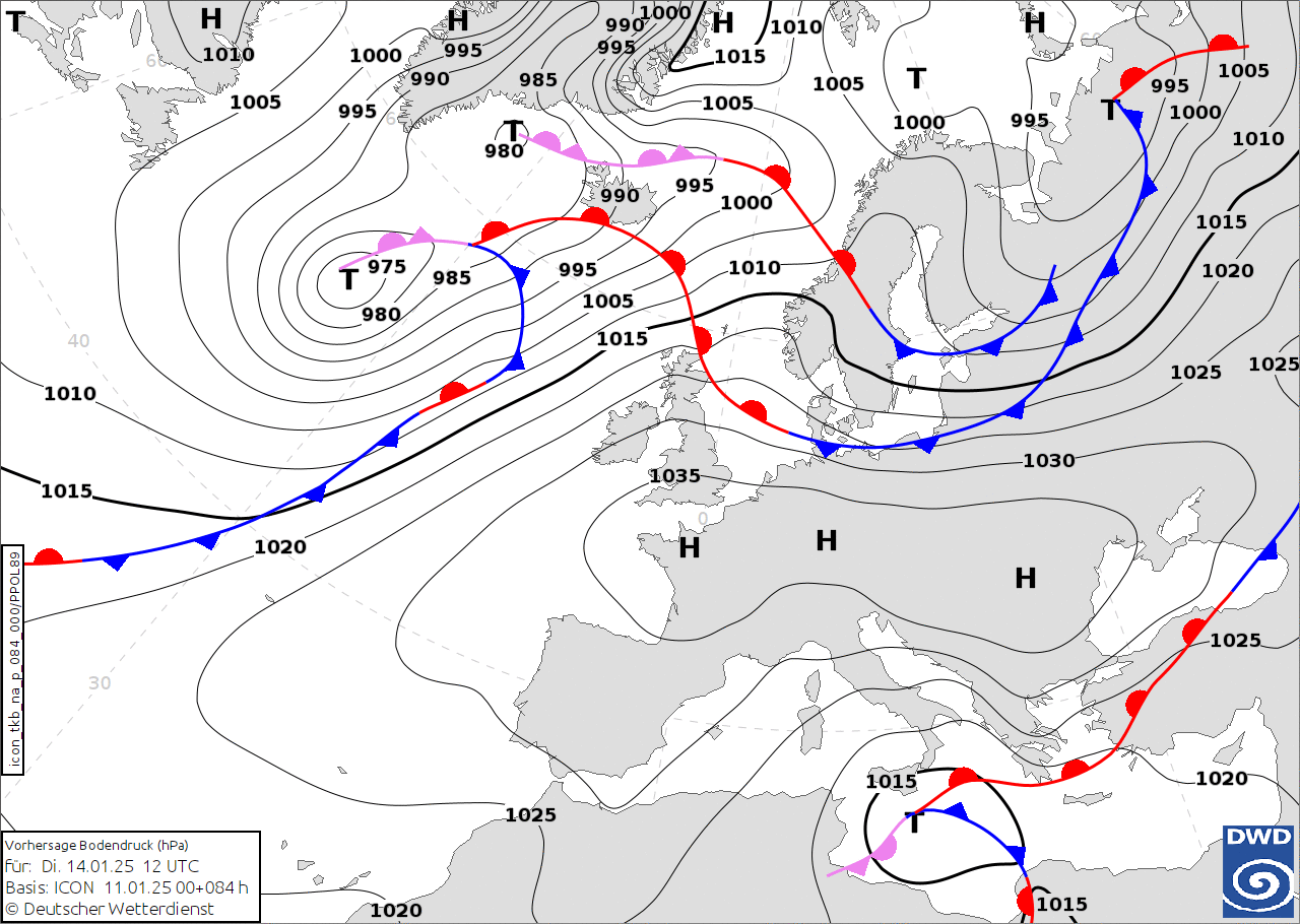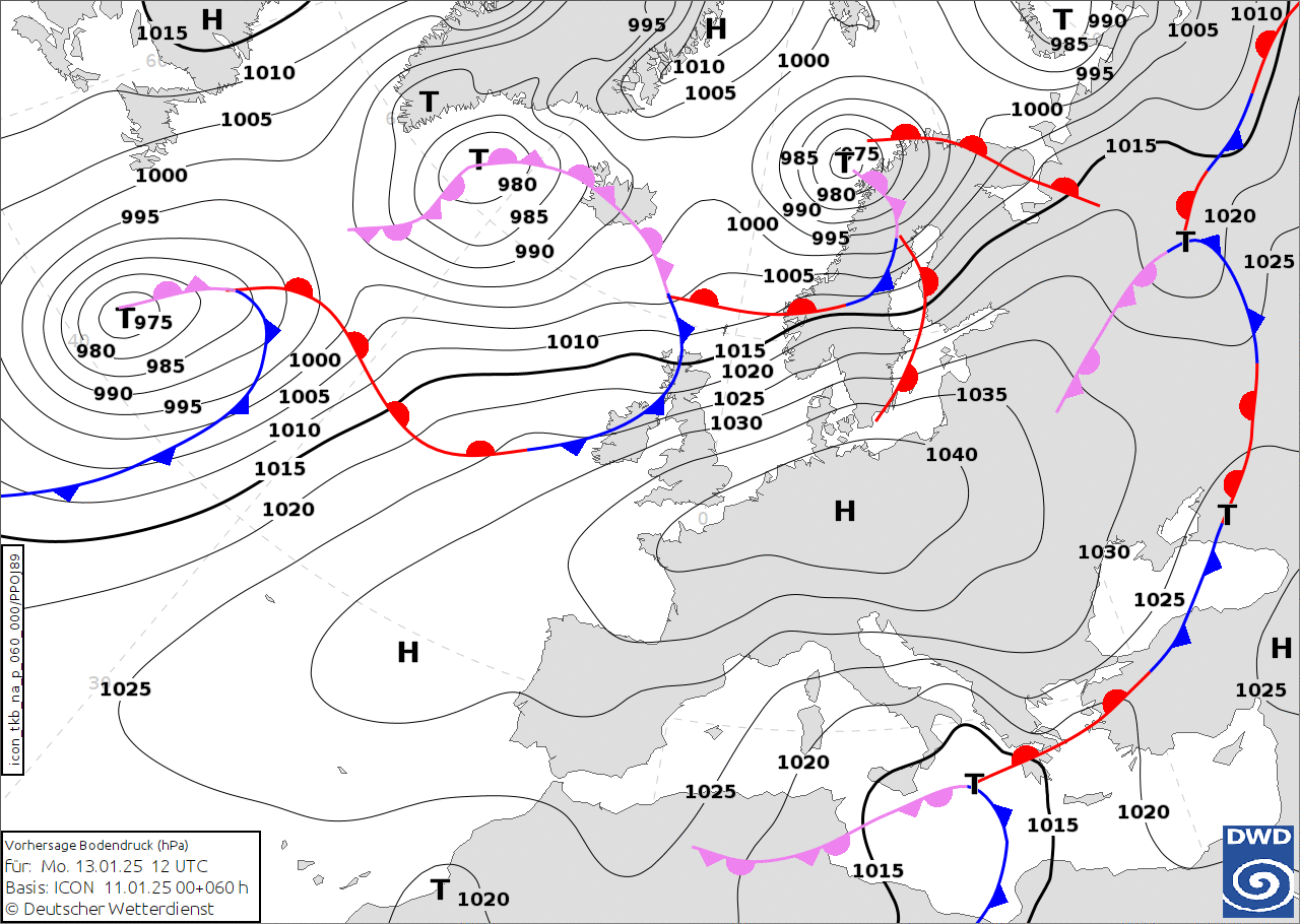 Eloquente, infatti, la carta per Lunedì 13 Gennaio, con il Ciclone posizionato sul mar Jonio e isolato in quest’area da un enorme e possente Anticiclone con massimi di 1040hPa nel cuore dell’Europa: