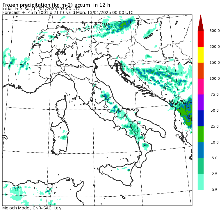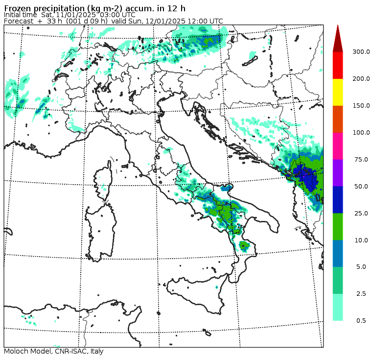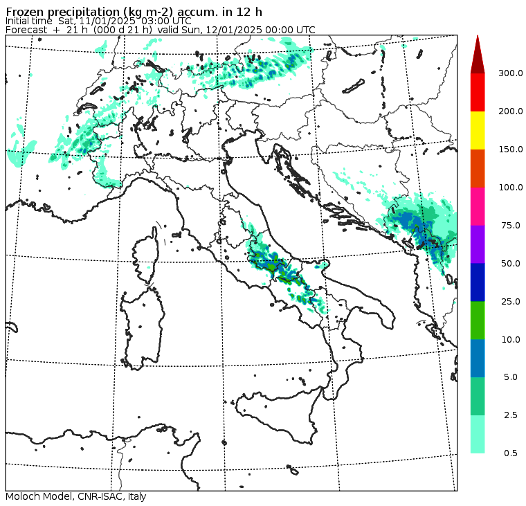 Le mappe con la previsione delle nevicate confermano l’eccezionalità della neve in arrivo al Sud, già da stasera in Abruzzo e Molise: