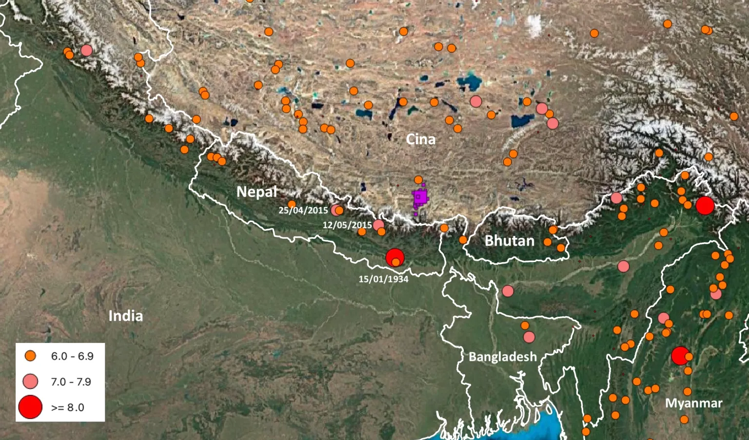“Si tratta di una zona caratterizzata da una sismicità molto rilevante, lungo la catena himalaiana formatasi dalla collisione tra la placca indiana e quella euroasiatica“, si spiega in un approfondimento pubblicato sul blog INGVterremoti. Nella mappa di seguito “si vede la sismicità dell’area dal 1900 a oggi, dove si notano alcuni terremoti avvenuti in territorio nepalese di magnitudo anche più elevata di quello odierno. In particolare, quello del 15 gennaio 1934 (magnitudo 8.0), quello del 25 aprile 2015 (magnitudo 7.8) e quello del 12 maggio 2015 (magnitudo 7.3). Con i quadrati viola sono riportati gli eventi avvenuti a partire da questa notte (poco più di una ventina)“.