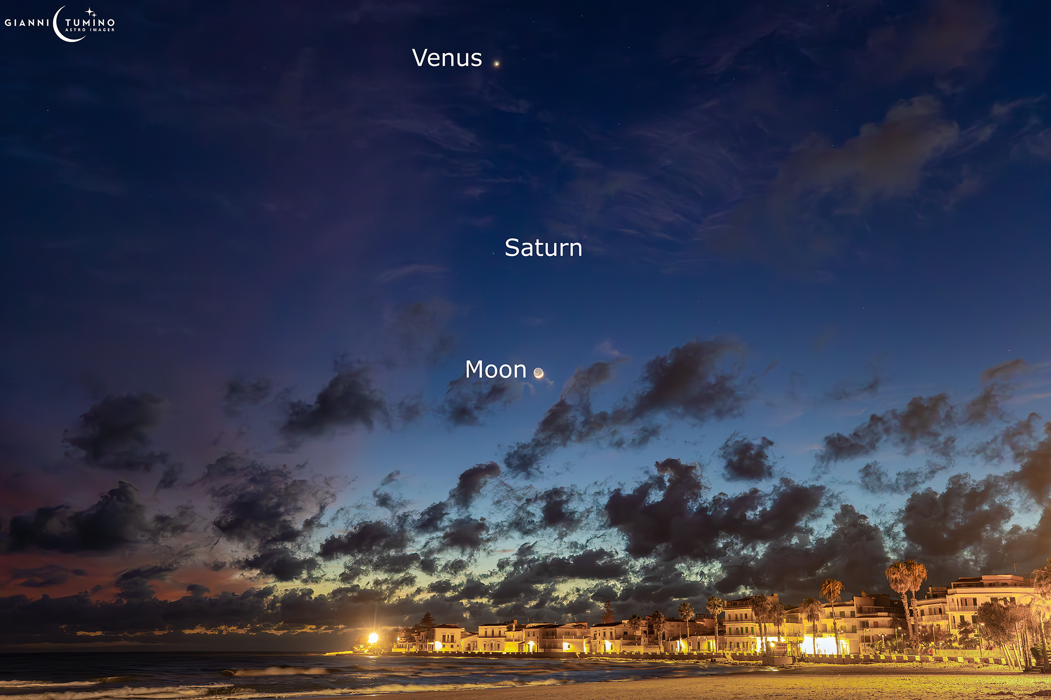 Tre importanti oggetti celesti dominano la scena astronomica stasera. Gianni Tumino ha immortalato Venere, Saturno e la Luna da Sampieri, sul litorale ragusano. I tre corpi appaiono quasi in linea nel cielo, come dimostrano le immagini che ci invia lo stesso Gianni Tumino, che fornisce anche i dati tecnici delle acquisizioni: