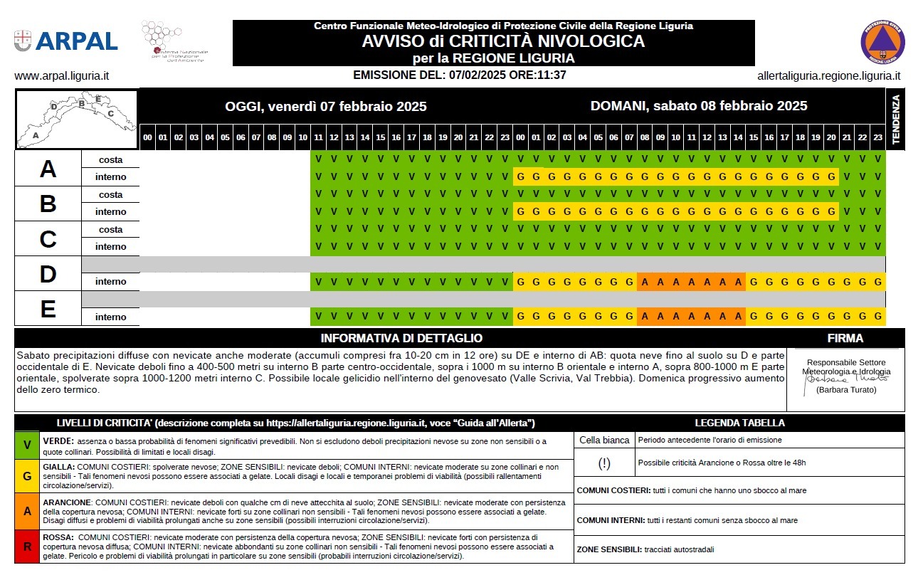 “Anche le valutazioni odierne confermano il weekend invernale alle porte, con tempo perturbato, calo dello zero termico dalla serata e precipitazioni in tutto il territorio regionale almeno fino a domenica mattina“: è quanto spiega Arpal in una nota, evidenziando che l’allerta meteo per neve in Liguria sarà gialla dalla mezzanotte alle 21 di sabato 8 febbraio sui comuni interni di A – B; sulle zone D – E sarà gialla da mezzanotte, arancione dalle 8 alle 15, poi gialla fino a mezzanotte.