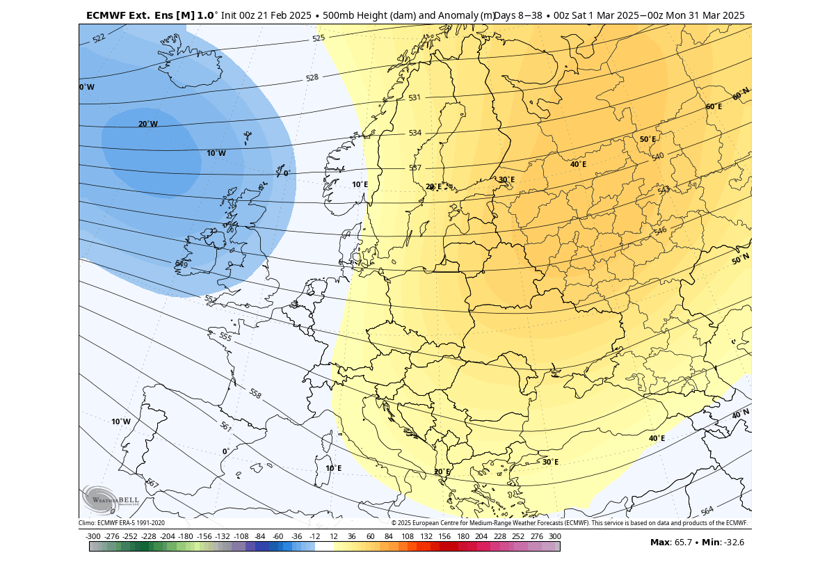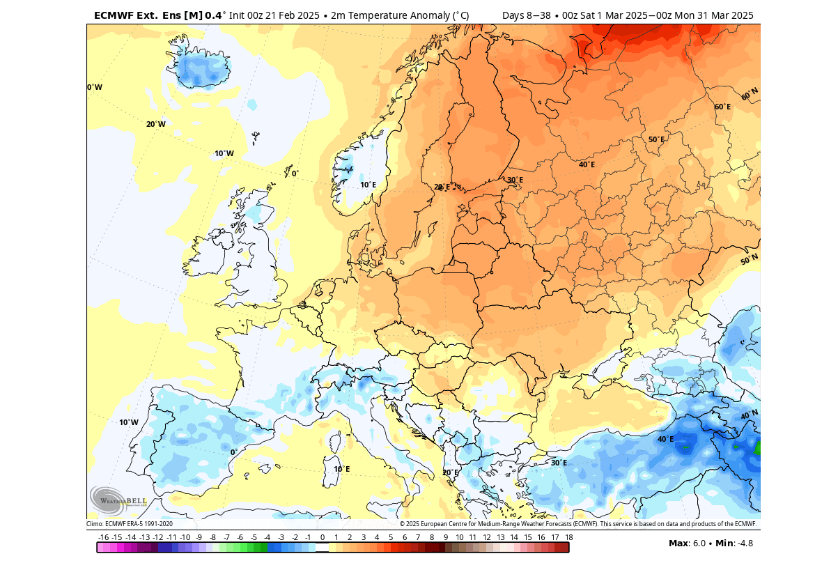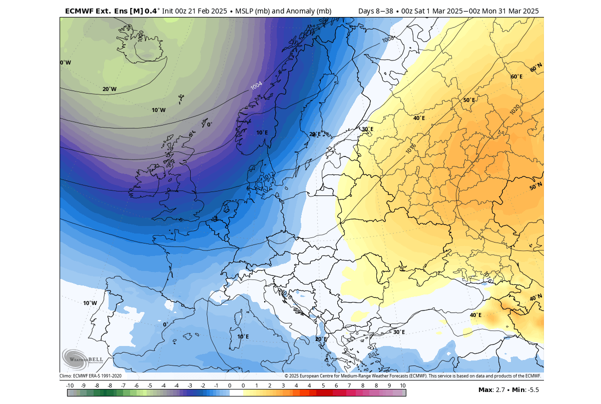 Marzo è il primo mese della primavera meteorologica: ecco cosa dicono le ultime tendenze secondo la previsione estesa dell’ensemble dell’ECMWF e una media mensile. La previsione estesa dell’ECMWF mostra principalmente una pressione più alta centrata sull’Europa centrale e orientale. Una zona di bassa pressione si trova nell’estremo Nord Atlantico e sull’Europa nordoccidentale, molto simile all’influenza primaverile La Niña di cui abbiamo parlato sopra.