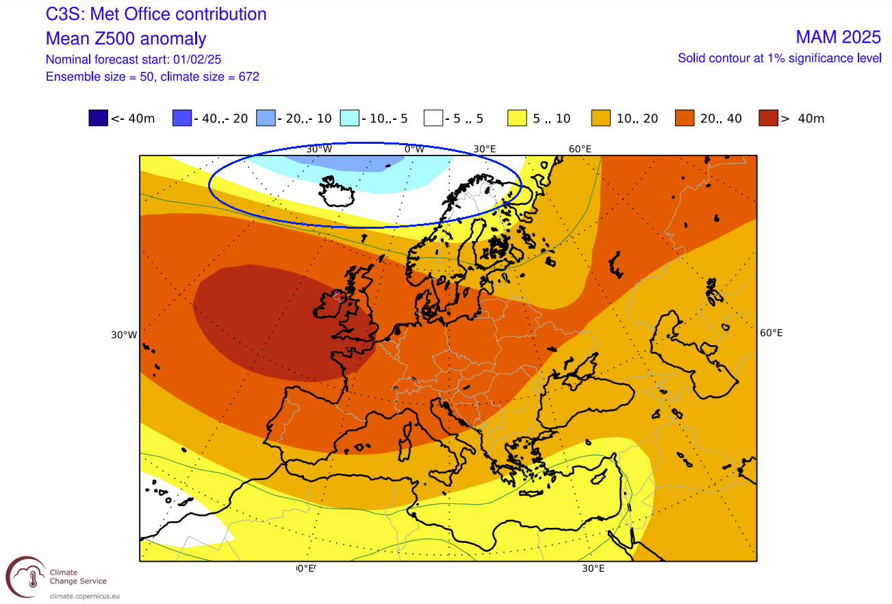 Ma cosa possiamo aspettarci dalla stagione primaverile nel suo complesso? Ecco cosa indicano i due principali modelli stagionali: ECMWF e UKMO. Queste previsioni mostrano un quadro medio su tre mesi meteorologici primaverili (marzo-aprile-maggio) e mostrano gli andamenti meteorologici prevalenti. Anche se i modelli fossero completamente accurati, ciò non significa che tali condizioni meteorologiche durerebbero tre mesi di fila. Suggeriscono solo come potrebbero essere i pattern meteorologici prevalenti durante la stagione.