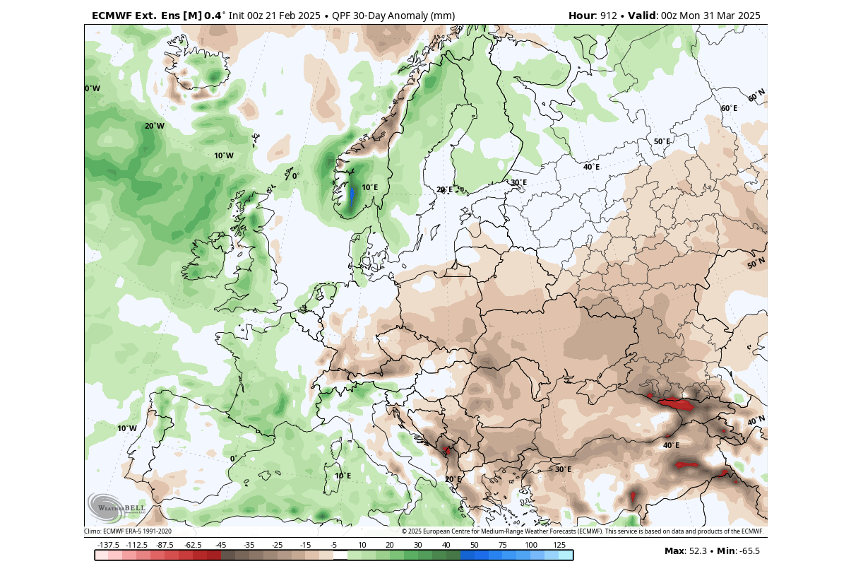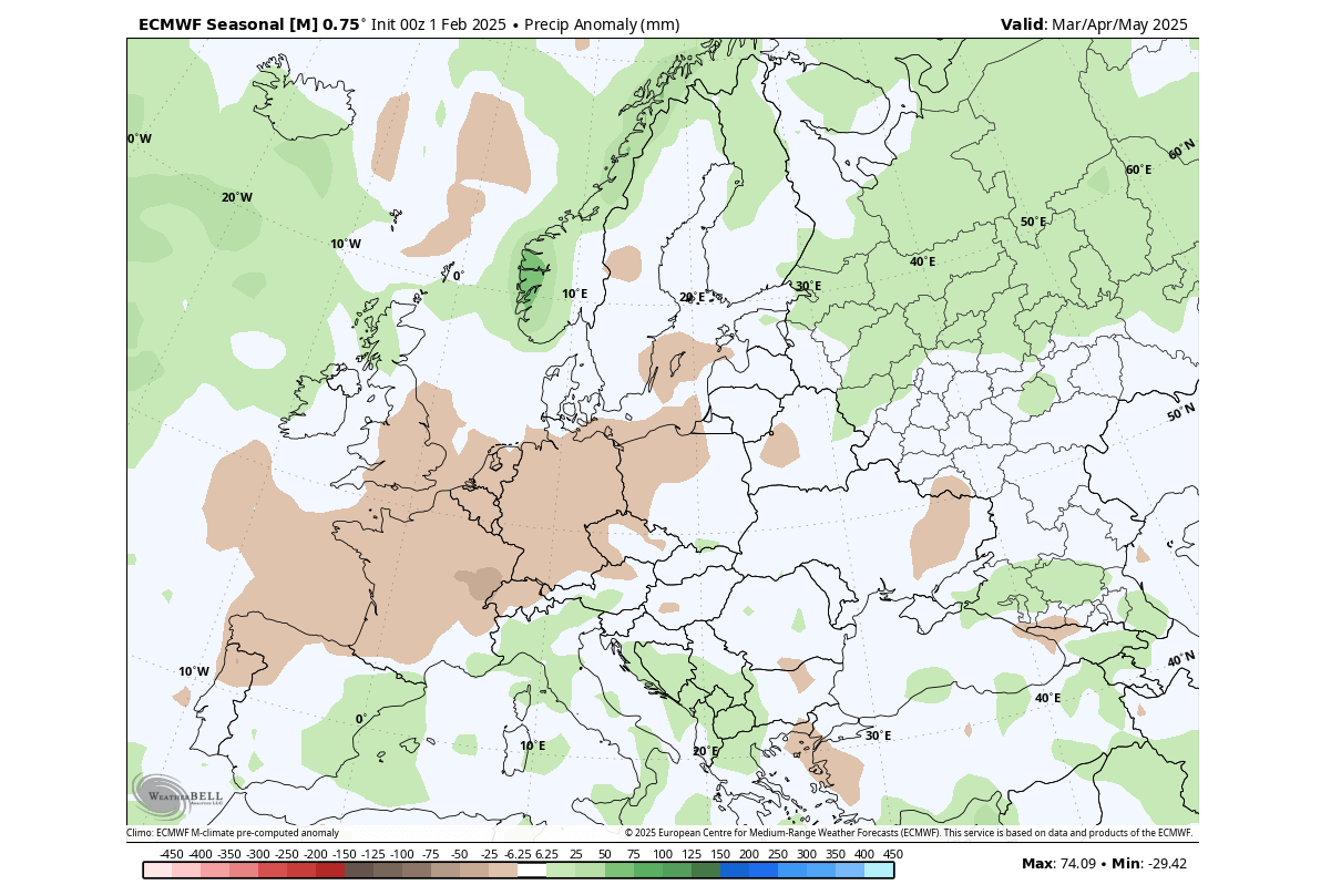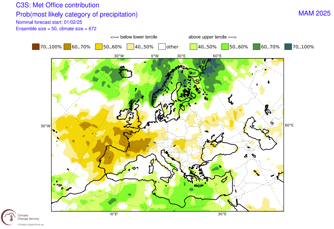 Le previsioni sulle precipitazioni indicano condizioni prevalentemente più asciutte su parti dell’Europa centrale e occidentale. Ma l’Europa settentrionale e meridionale mostrano più precipitazioni in primavera, indicando l’influenza della zona di bassa pressione a nord e di una zona di pressione più bassa sul Mar Mediterraneo.