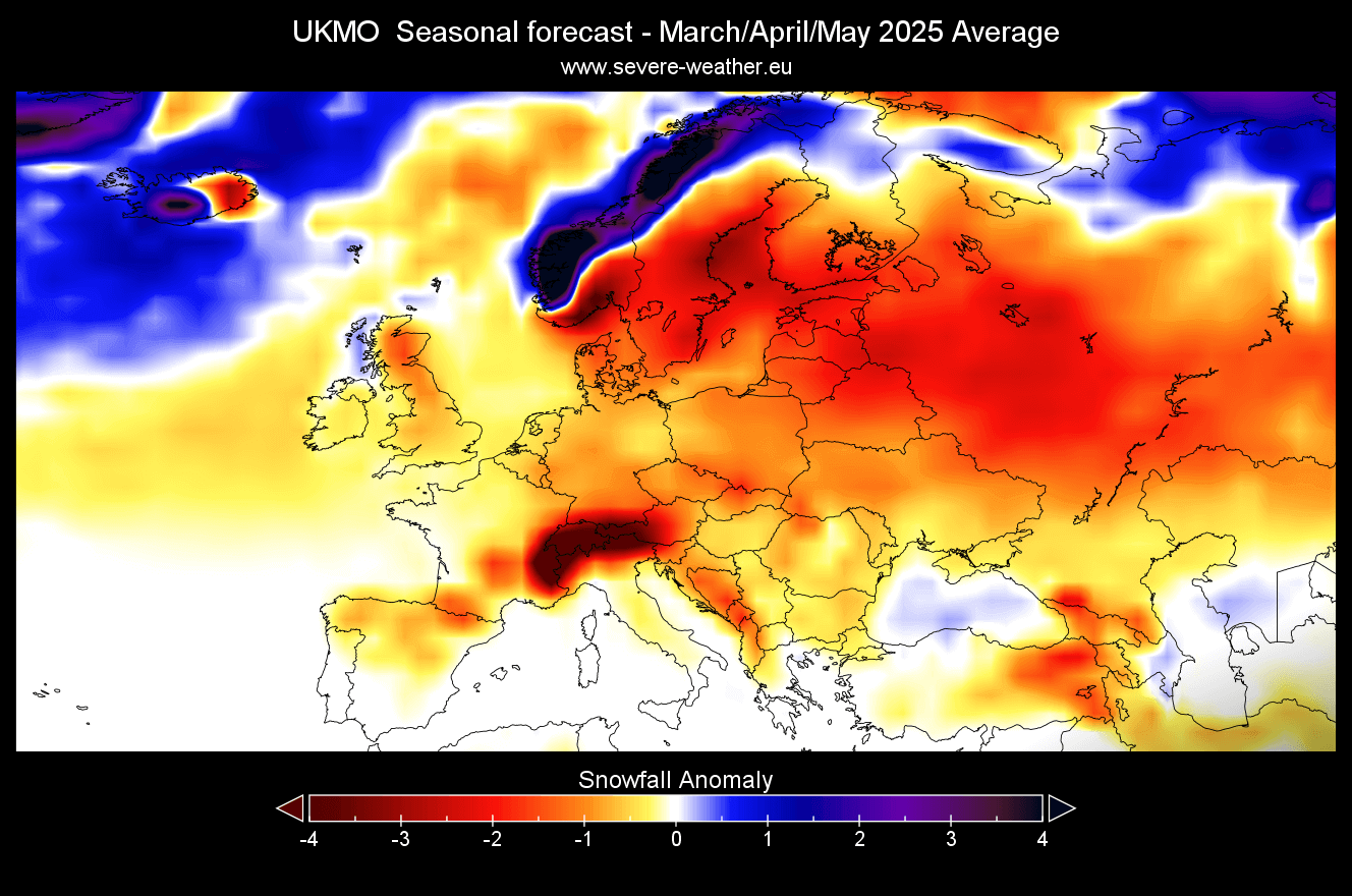 Le previsioni di nevicate UKMO indicano che sono più deboli e inferiori alla norma per la stagione. Ma questo è prevedibile con temperature superiori alla norma e un sistema di alta pressione dominante sul continente. Sono previste altre nevicate primaverili sulla Scandinavia nordoccidentale, dove le temperature sono ancora abbastanza basse e una regione di bassa pressione porta molte precipitazioni.