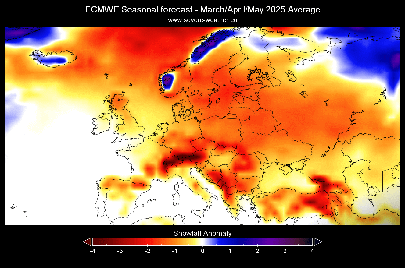 In combinazione con temperature più basse, ciò influisce anche sul potenziale di nevicate all’inizio della primavera. Mentre la primavera è generalmente nota come l’inizio della parte più calda dell’anno, ci sono ancora eventi di nevicate, soprattutto a marzo. Tuttavia, secondo le ultime previsioni sulla neve da marzo a maggio 2025, la maggior parte del continente vedrà nevicate inferiori alla norma. Ovviamente, questo non significa che non ci saranno nevicate; significa solo che sono meno comuni della media degli ultimi 30 anni.
