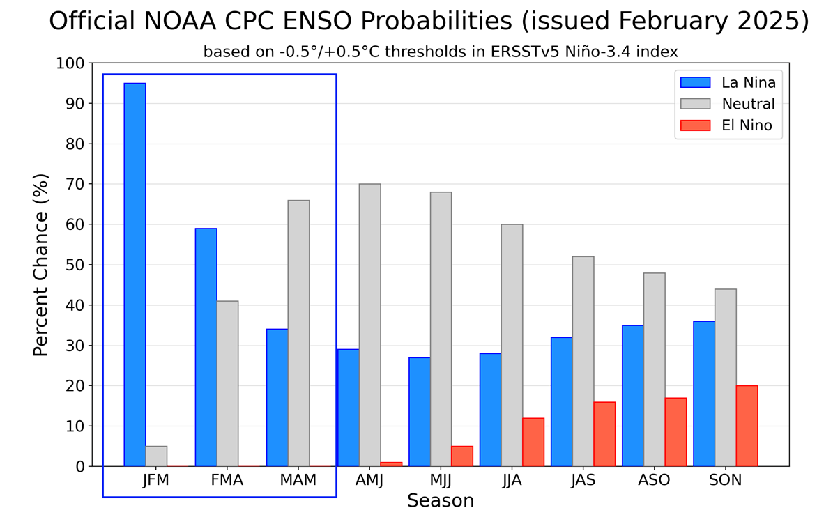 Le previsioni della fase ENSO da CPC indicano che La Niña rimarrà almeno fino all’inizio della primavera. Ma l’impatto atmosferico di anomalie così grandi può durare più a lungo, coprendo l’intera stagione primaverile dell’emisfero settentrionale.