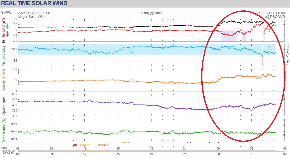 Oggi, 24 marzo 2025, alle 01:38 ora italiana, un’Espulsione di Massa Coronale (CME) ha colpito il campo magnetico terrestre con quasi 24 ore di ritardo rispetto alle previsioni. Tuttavia, l’impatto non è stato così intenso come inizialmente stimato e non ha generato una tempesta geomagnetica “forte” (G3). Nonostante ciò, gli esperti dello Space Weather Prediction Center della NOAA segnalano che rimangono possibili tempeste geomagnetiche di grado G1 (minore) e G2 (moderata) mentre la Terra attraversa il campo magnetico lasciato dalla CME. Inoltre, gli abitanti delle alte latitudini potrebbero avere l’opportunità di osservare spettacolari aurore boreali nei cieli notturni.