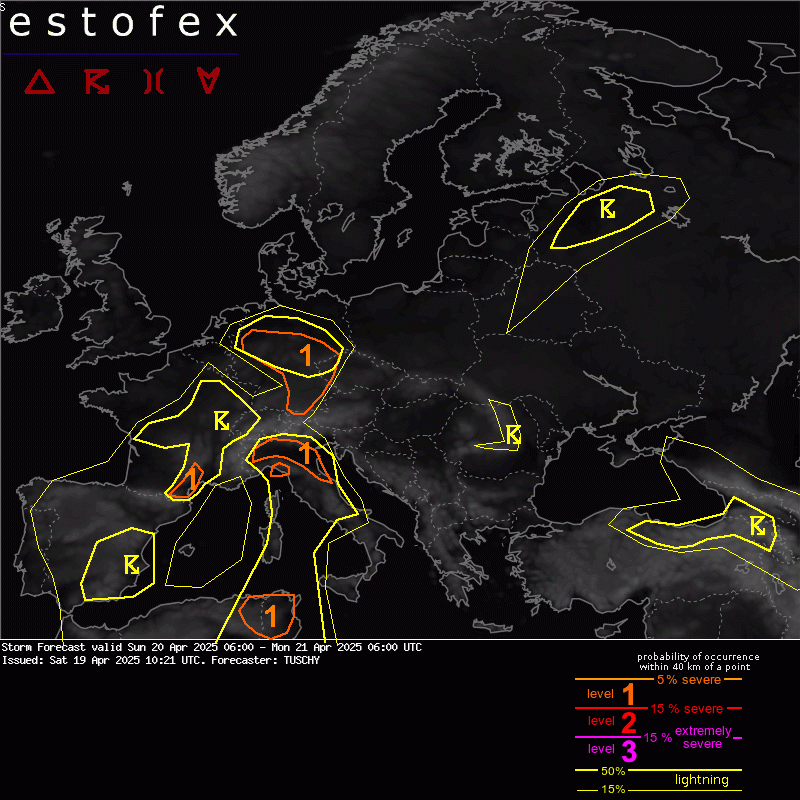 Allerta Meteo nelle prossime ore in Italia per forti piogge, rischio grandine, vento forte e tornado: il Centro ESTOFEX (European Storm Forecast Experiment) ha emesso un avviso valido dalle 8 di oggi, 20 aprile 2025, alle 8 di domani 21 aprile 2025. In dettaglio, “un livello 1 è stato emesso nell’area di Genova, principalmente per forti piogge e rischio tornado isolato/costiero. Un livello 1 è stato emesso per alcune parti dell’Italia settentrionale, principalmente per alcuni eventi di grandine e raffiche di vento, ma principalmente per forti piogge. Un livello 1 è stato previsto per la Francia sudorientale, principalmente per isolati eventi di forti piogge. Emesso livello 1 per alcune parti della Germania, con un mix di forti piogge e alcune grandinate/raffiche di vento. Un livello 1 è stato emesso per l’Algeria nordorientale e la Tunisia settentrionale, principalmente per grandine di grandi dimensioni e raffiche di vento intense“.