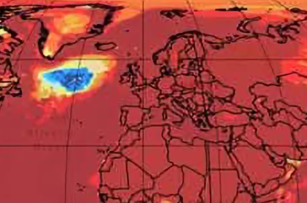 La spiegazione di questa zona di raffreddamento passa per uno dei sistemi di circolazione oceanica più importanti al mondo: l’AMOC, acronimo di Atlantic Meridional Overturning Circulation. Questo sistema, di cui fa parte la ben nota Corrente del Golfo, ha il compito di trasportare grandi quantità di calore dalle regioni equatoriali verso l’Europa settentrionale.