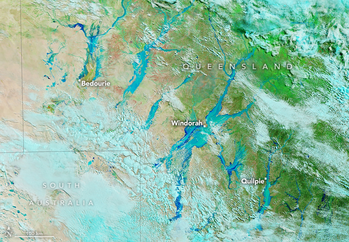 Nella settimana conclusasi il 29 marzo, alcune parti dello stato hanno ricevuto più di 400 millimetri di pioggia. Le acque alluvionali vicino a Windorah, Jundah e altre città sono salite a livelli superiori a quelli registrati nel 1974, un anno storico per le inondazioni dell’outback e l’anno più piovoso mai registrato in Australia. Le strade allagate potrebbero lasciare le città isolate per settimane.