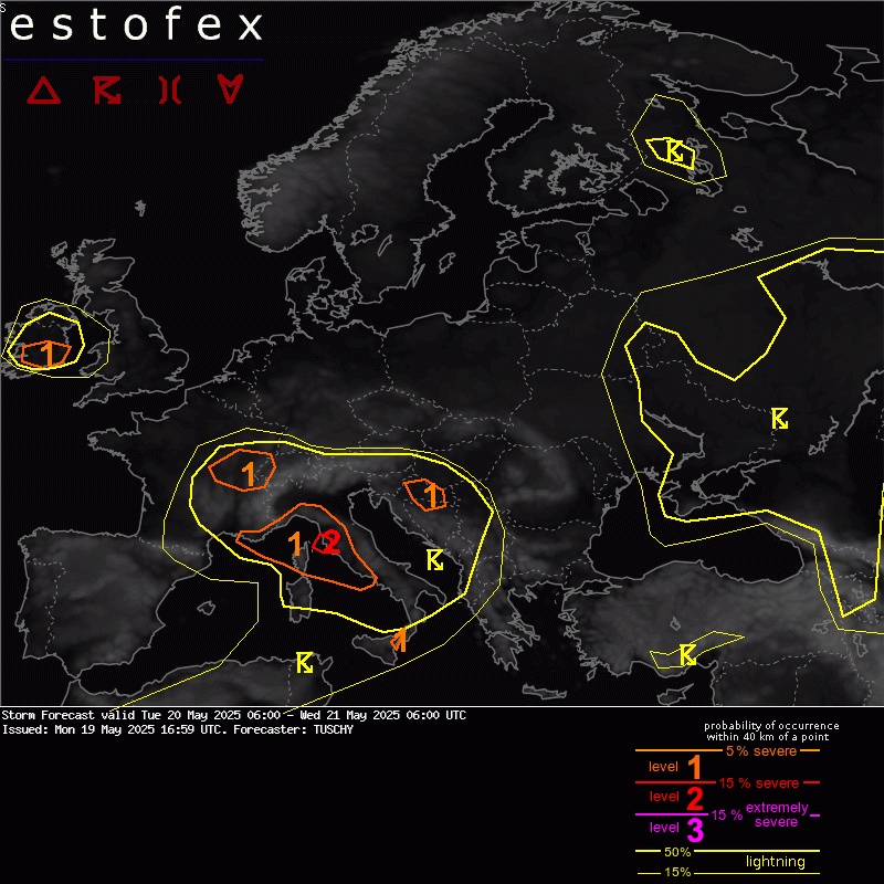 Un nuovo peggioramento prenderà il via domani sulle regioni del Centro-Nord dell’Italia favorito dall’arrivo di un ciclone proveniente da Spagna e Francia. Per domani, martedì 20 maggio, Estofex (European Storm Forecast Experiment) ha emesso un livello 2 di allerta per un’area al largo a ovest del Golfo di Follonica, principalmente per rischio di tornado, forti piogge, grandine di grandi dimensioni e forti raffiche di vento. Un livello 1 circonda questo livello 2 per pericoli simili, ma con probabilità inferiori. Un livello 1 è stato emesso per la Sicilia nordorientale, per un rischio isolato di grandine di grandi dimensioni.