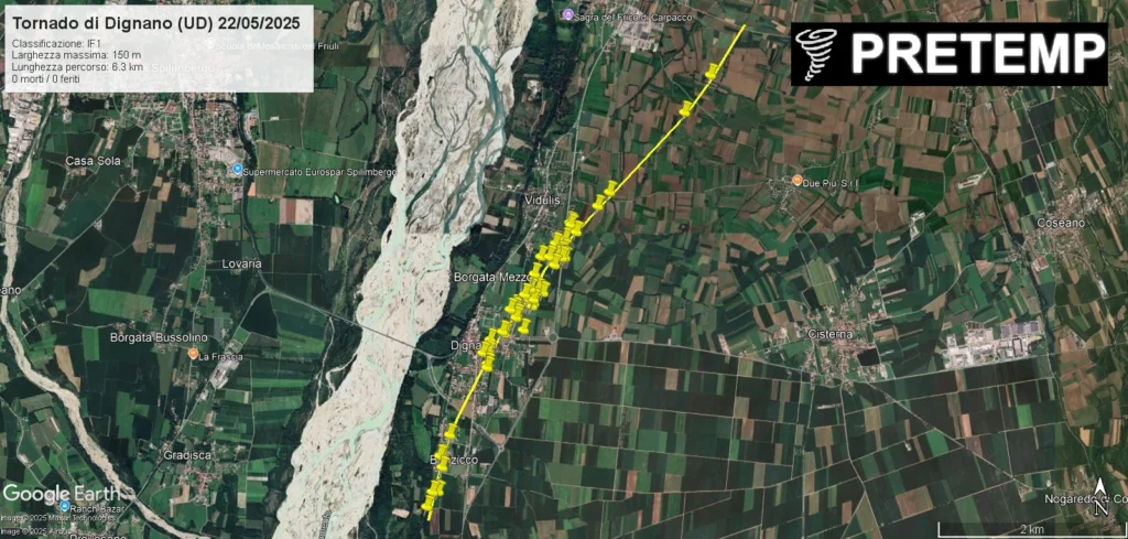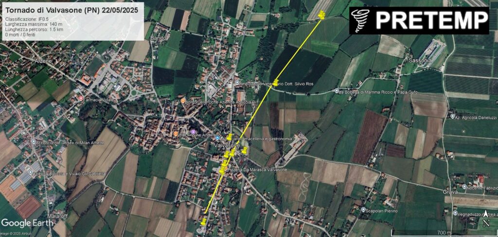 Valvasone (PN): “Il più debole dei tornado si è apparentemente formato sul centro abitato per poi spostarsi nelle campagne a nord-est dopo aver causato lievi danni a tetti e vegetazione, danni valutabili al più al grado IF0.5 della Scala IF e F0 sulla classica Scala Fujita. Nonostante non ci siano video o foto del vortice, il pattern convergente/casuale di danno, il percorso lungo e stretto e la presenza di rotazione del vento nelle immagini di velocità radiale dell’OSMER/Arpa Friuli-Venezia Giulia supportano un evento tornadico, anziché un downburst”, spiegano da Pretemp.