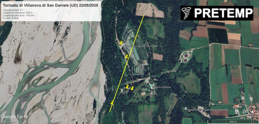 Villanova di San Daniele (UD): “Questo tornado si è probabilmente sviluppato lungo il Tagliamento per poi colpire zone forestali ad ovest del centro abitato e, che si sappia, non ha interessato strutture. Gli indizi per il suo riconoscimento sono uguali ai due precedenti, come è uguale la classificazione dei danni alle foreste interessate ad IF1-F1”, spiegano gli esperti di Pretemp.