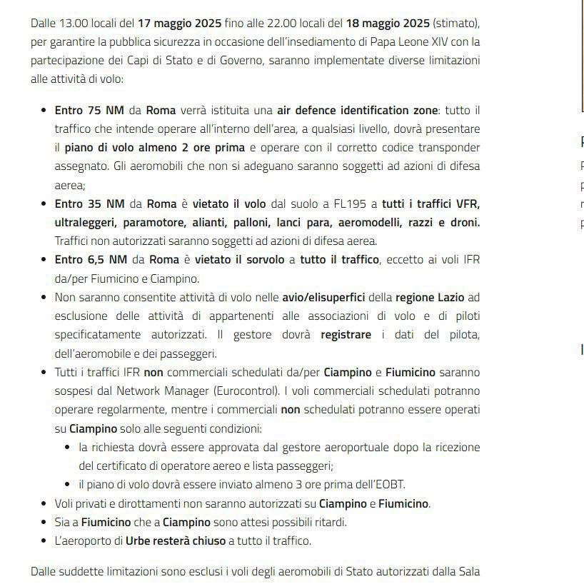 Diverse limitazioni alle attività di volo su Roma e su parti del Lazio in occasione dell’intronizzazione di Papa Leone XIV