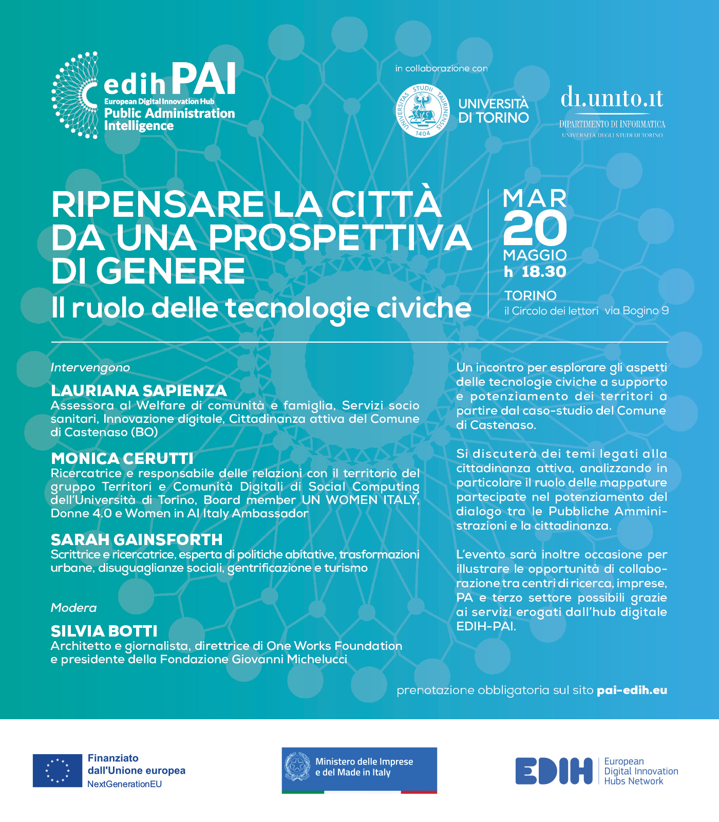Martedì 20 maggio 2025, ore 18.30, al Circolo dei lettori di Torino, si terrà l’incontro Ripensare la città da una prospettiva di genere. Il ruolo delle tecnologie civiche, dedicato al ruolo del digitale nel potenziamento dei processi di cittadinanza attiva a partire dal progetto Verso il Crowdmapping femminile: la mappa digitale per leggere Castenaso in ottica di genere, realizzato nel 2024 dal Comune di Castenaso (BO), in collaborazione con il gruppo di ricerca Territori e Comunità Digitali di Social Computing del Dipartimento di Informatica dell’Università di Torino.