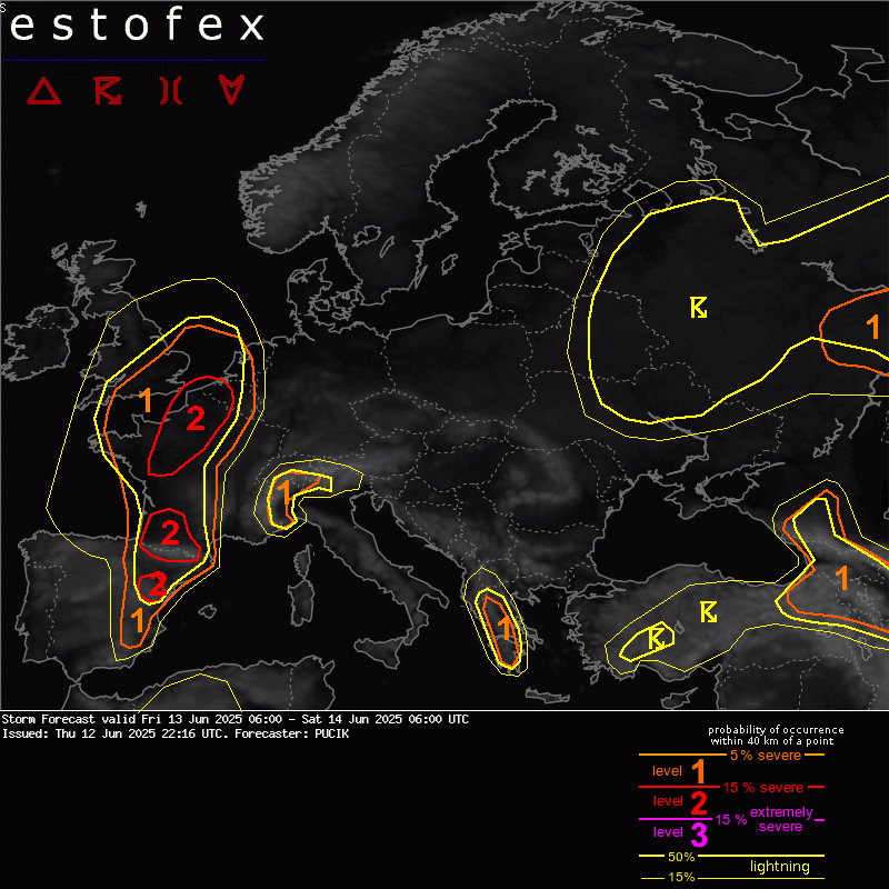 Allerta Meteo per una precisa area d’Italia oggi, per forti piogge e grandine di grandi dimensioni: il Centro ESTOFEX (European Storm Forecast Experiment) ha emesso un avviso valido dalle 8 di oggi 13 giugno 2025, alle 8 di domani 14 giugno 2025. In dettaglio, un livello 2 è stato emesso in alcune parti di Spagna, Francia e Belgio, principalmente per grandine di grandi dimensioni o molto grandi, raffiche di vento dannose e, in misura minore, per forti piogge. Anche un livello 1 è stato previsto per i suddetti Paesi, per gli stessi rischi, ma con una probabilità inferiore. Un livello 1 è stato emesso per Inghilterra, principalmente per forti piogge e grandine di grandi dimensioni.