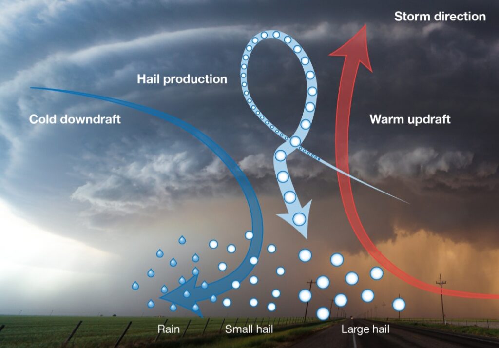 Più è intensa la corrente ascensionale, più a lungo il chicco resta all’interno della nube. Quando la sua massa diventa eccessiva anche per queste correnti, precipita al suolo con violenza, causando spesso danni ingenti a tetti, auto, coltivazioni e infrastrutture.