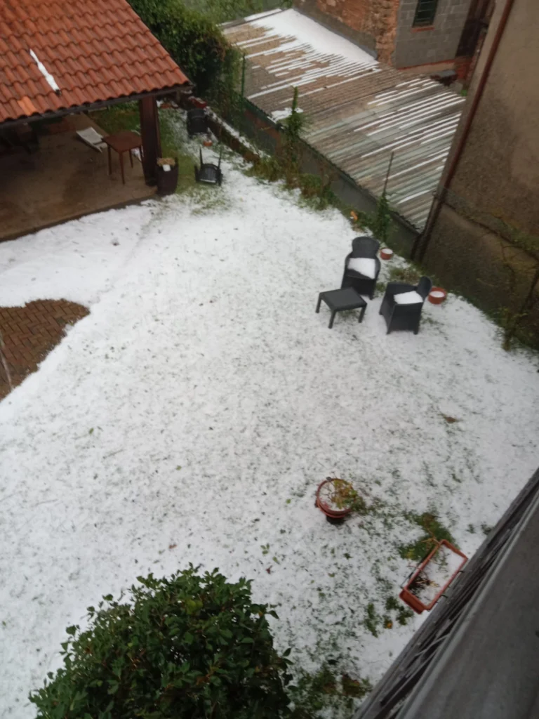 Un’altra violenta grandinata, con chicchi fino a 3-4cm di diametro, ha colpito Pray, nel Biellese, dove si è abbattuto un temporale con fortissime raffiche di vento, come dimostrano le immagini a corredo dell’articolo. Un downburst molto severo e grandine medio-grande è stata registrata anche a Lessona.
