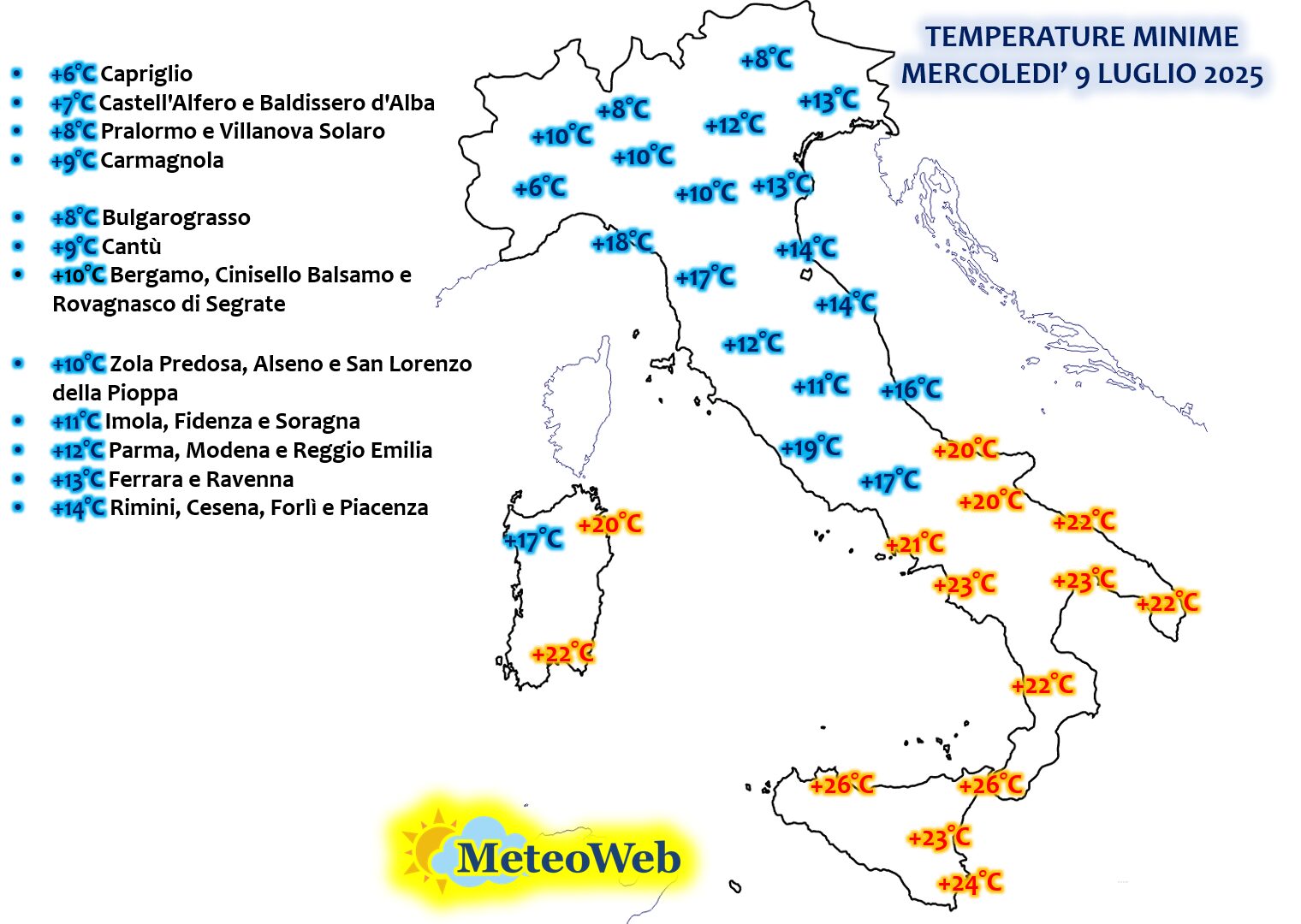 Giornata storica oggi per l’Italia, una delle 5 giornate della storia di Luglio più fredde degli ultimi 150 anni nel nostro Paese. Le temperature minime dell’alba sono state diffusamente inferiori ai +10°C in pianura Padana con picchi addirittura di +6°C in Piemonte, ma i valori minimi hanno raggiunto i +12/+13°C ovunque anche nelle principali città. Freddo anomalo anche al Centro Italia, specie versante Adriatico, e prima rinfrescata al Sud in attesa del picco del freddo nei prossimi due giorni.