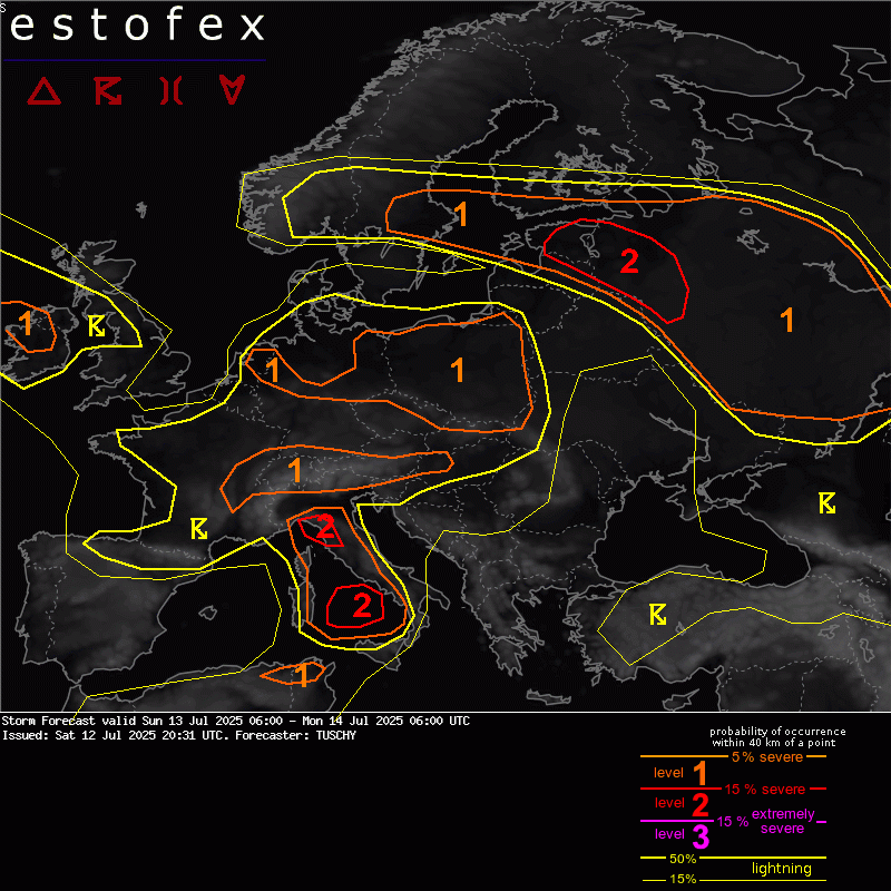 Livello 2 per alcune zone del Mar Tirreno, principalmente per grandine di grandi dimensioni o molto grande, forti piogge, forti raffiche di vento e alcuni tornado. Livello 2 per alcune zone del Nord/Ovest d’Italia, principalmente per pioggia eccessiva e un evento tornado isolato. Le aree di livello 1 circondano tutte le aree di livello 2 per pericoli simili, ma con probabilità ridotte.