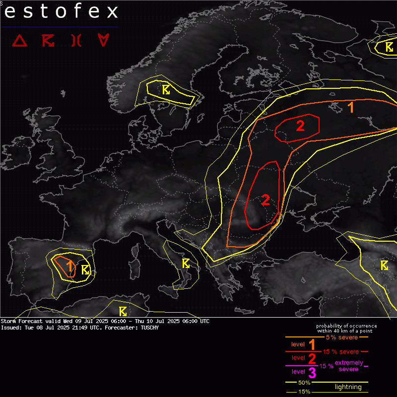 Allerta Meteo in diversi Paesi, mentre il rischio temporali in Italia si sposta al Centro/Sud: il Centro ESTOFEX (European Storm Forecast Experiment) ha emesso un avviso valido dalle 8 di oggi 9 luglio 2025, alle 8 di domani 10 luglio 2025. In dettaglio, un livello 2 è stato emesso per Romania e Bielorussia sudorientale per grandine di grandi dimensioni, forti raffiche di vento e pioggia intensa. Livello 2 per Bielorussia nordorientale e Russia principalmente per grandine di grandi dimensioni, forti raffiche di vento, pioggia intensa e rischio di tornado. Un livello 1 circonda entrambe le aree di livello 2 per pericoli simili, ma con probabilità ridotte.