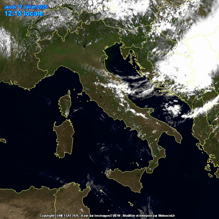 Mentre pubblichiamo questo nuovo articolo di aggiornamento meteo per i prossimi giorni, forti temporali stanno colpendo l’Abruzzo, il Molise, la Campania e la Puglia. Sono già caduti 38mm di pioggia a Baselice, in provincia di Benevento ma a pochi chilometri da Lucera (Foggia), mentre in Abruzzo abbiamo temperature crollate a +19°C in collina sotto i colpi della pioggia accompagnata da tuoni fragorosi e raffiche di fulmini e saette. Il maltempo di questo pomeriggio temporalesco è appena iniziato, e le immagini satellitari sono in continua evoluzione: raccontano magistralmente lo sviluppo dei cumulonembi visto dallo Spazio.