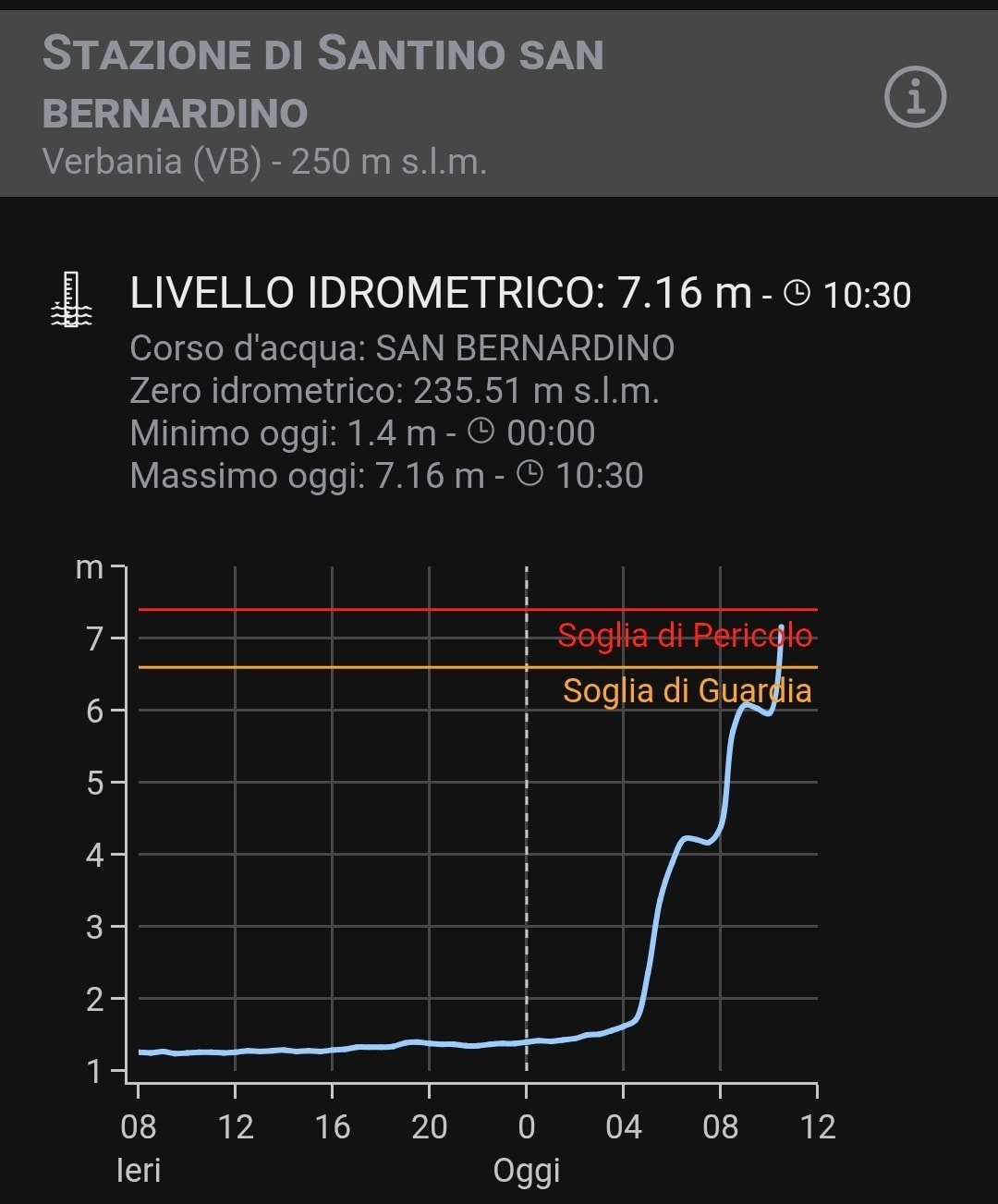 Continua a piovere in Piemonte a causa della perturbazione originata dai resti dell’ex Uragano Erin, e le intense precipitazioni stanno determinando innalzamenti dei corsi d’acqua. Centro Meteo Piemonte riporta un’impennata del torrente San Bernardino a Verbania: raggiunti i 7.16 metri, si sfiora la soglia rossa di pericolo. Gli accumuli pluviometrici in zona prealpina sfiorano ormai i 200 mm nelle ultime 36 ore, in ulteriore incremento nel corso del pomeriggio-sera di oggi.