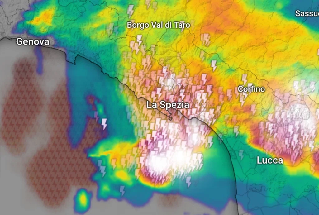 Una vera e propria tempesta di fulmini sta interessando in queste ore la Liguria di levante, con particolare intensità sullo Spezzino, dove nelle ultime 24 ore sono state rilevate oltre 40.000 scariche elettriche. Si tratta di un episodio di straordinaria portata, che segue la violenta attività temporalesca della notte precedente e che conferma come la regione sia attualmente uno dei principali bersagli della perturbazione atlantica in transito sull’Italia.