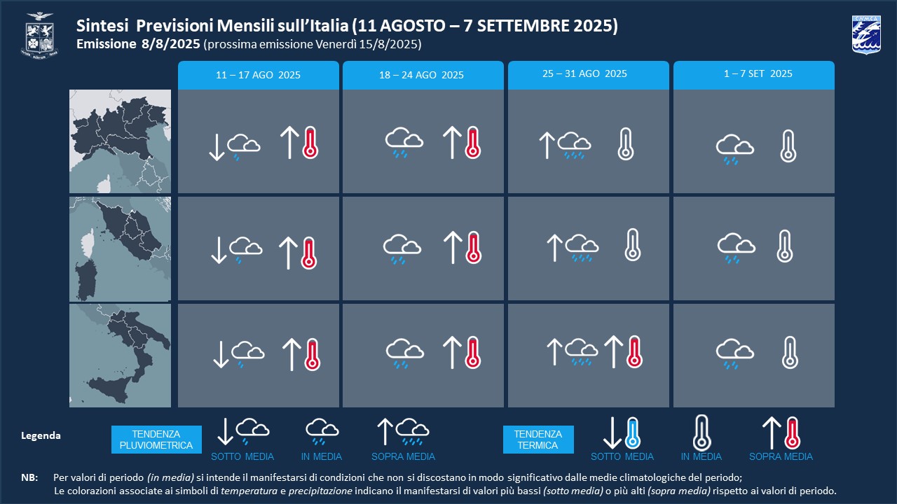 Il Centro Nazionale di Meteorologia e Climatologia Aeronautica (CNMCA) dell’Aeronautica Militare ha pubblicato le previsioni meteo mensili per l’Italia. Ecco la tendenza delineata fino al 7 settembre.