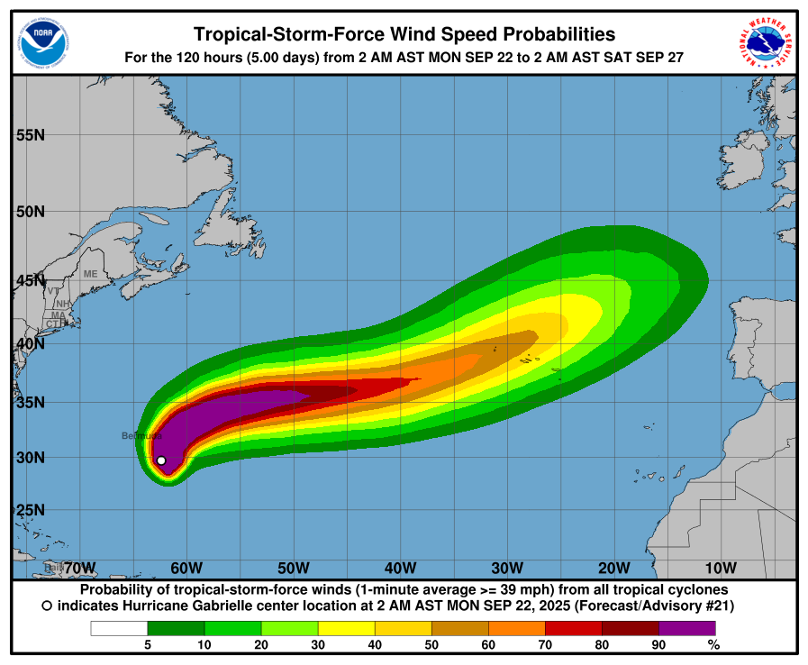 Non è impossibile che un uragano nasca in prossimità del corridoio Bermuda–Nord Atlantico quando incontra acque ancora abbastanza calde, wind shear contenuto e flussi umidi in quota. L’insolito, oggi, è la rapida intensificazione avvenuta in un’area più a nord del classico “percorso di Capo Verde”, non la mera presenza di un uragano in zona. Ecco perchè Gabrielle non colpirà territori americani ma si dirigerà rapidamente verso l’Europa nei prossimi giorni, come illustrano le mappe del NOAA che pubblichiamo a corredo dell’articolo.