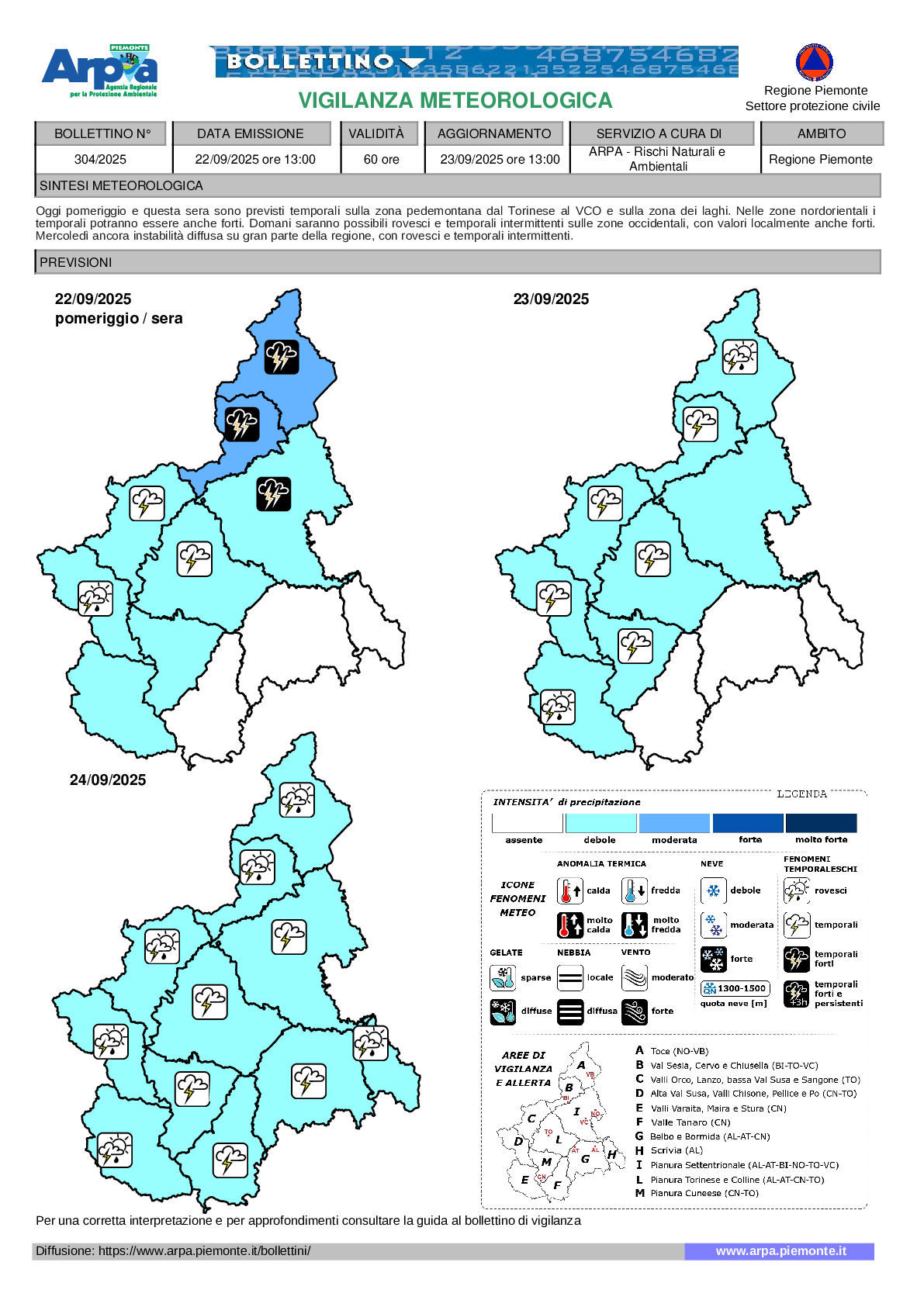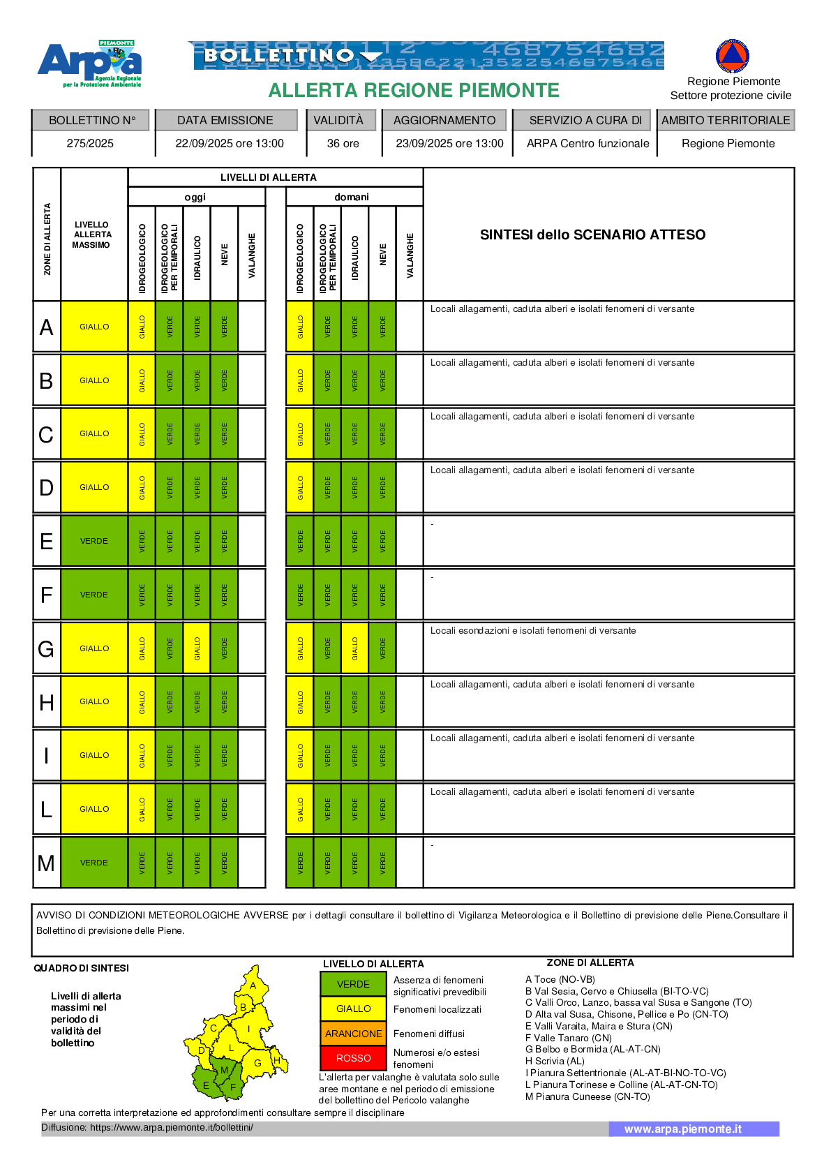 Allerta meteo gialla in Piemonte “per rischio idrogeologico e idraulico. Oggi pomeriggio e questa sera sono previsti temporali sulla zona pedemontana dal Torinese al VCO e sulla zona dei laghi, anche forti nelle zone nordorientali. Domani saranno possibili rovesci e temporali intermittenti sulle zone occidentali, con valori localmente anche forti“: è quanto si legge nel bollettino di allerta meteo pubblicato oggi 22 settembre 2025 da Arpa Piemonte.