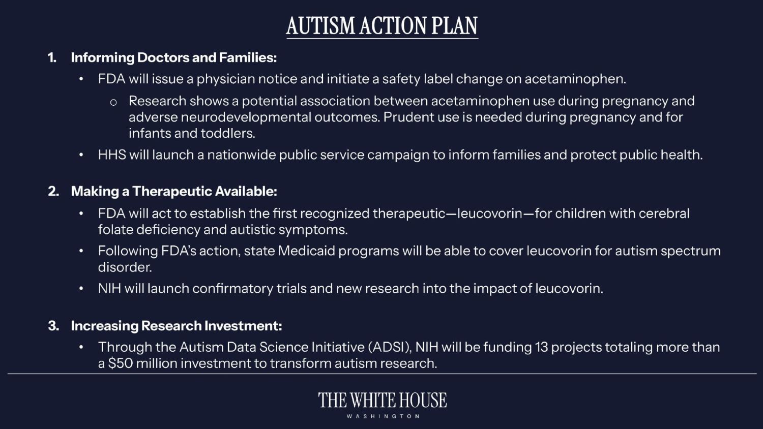 Il tema su cui ha insistito più di tutti, tuttavia, è stato dichiarare un presunto legame tra autismo e acetaminofene, noto nella maggior parte dei paesi al di fuori degli Stati Uniti come paracetamolo.