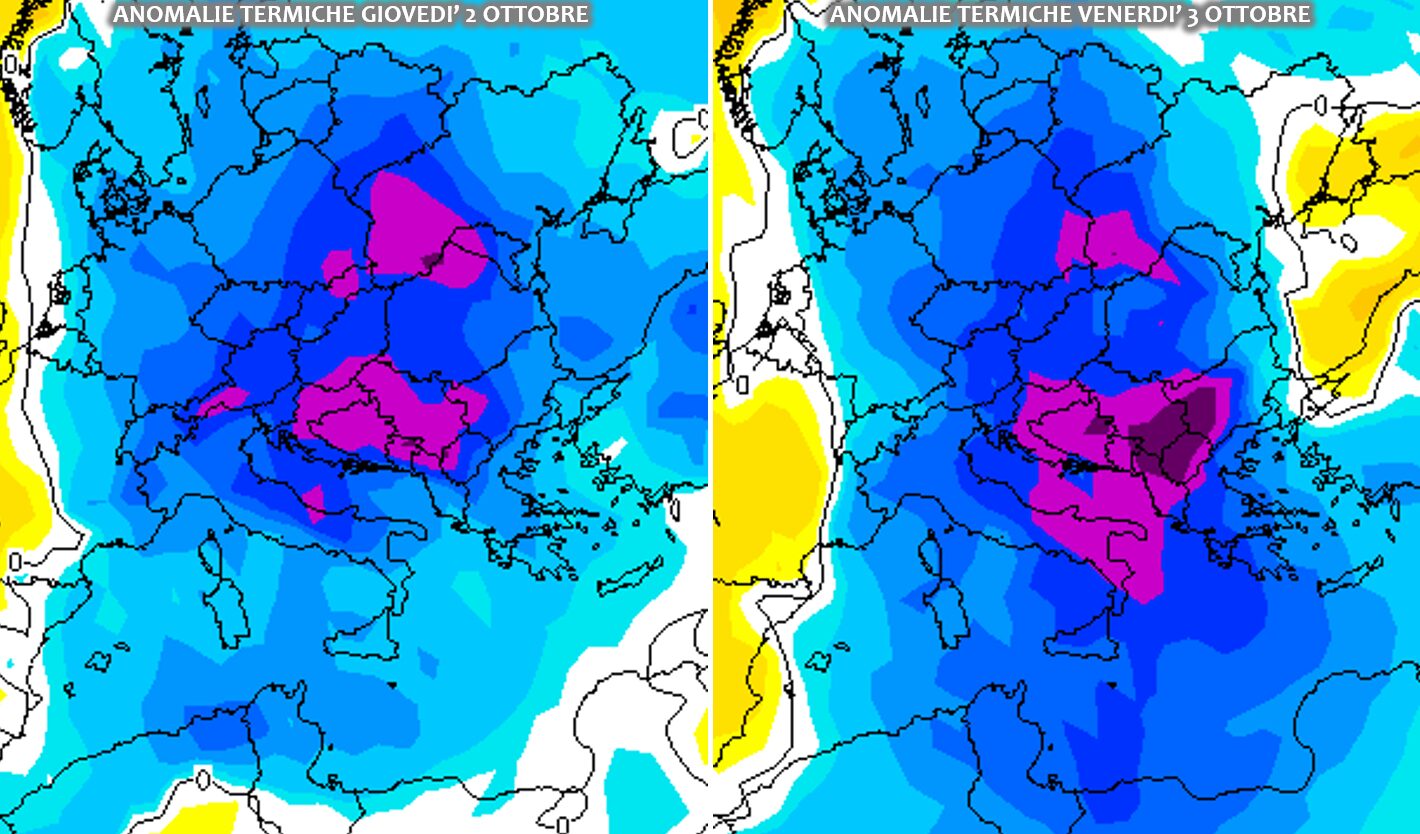 Anche le mappe con le anomalie termiche previste per domani e dopodomani confermano gli scarti di oltre 10°C sotto le medie storiche del periodo su gran parte d’Italia, soprattutto sulle Regioni Adriatiche e al Sud, in un contesto molto freddo per tutta l’Europa centro-orientale, tra l’Italia, i Balcani e tutta l’area Mittel-Europea (Europa centrale):