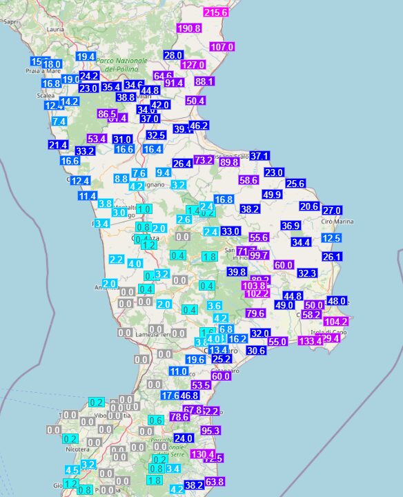 Sono infatti eccezionali i dati pluviometrici che arrivano da quest’area. In Calabria spiccano i 216mm di pioggia caduti a Rocca Imperiale, ma anche 191mm a Oriolo, 127mm ad Albidona, 107mm a Roseto Capo Spulico sul litorale, 91mm a Cerchiara di Calabria, 88mm a Trebisacce ancora sulla costa. Notevoli, un po’ più a Sud ma sempre nella Calabria jonica settentrionale, i 90mm di pioggia caduti a Rossano e i 73mm di Corigliano. E’ stata una grande piovuta su gran parte della Regione.