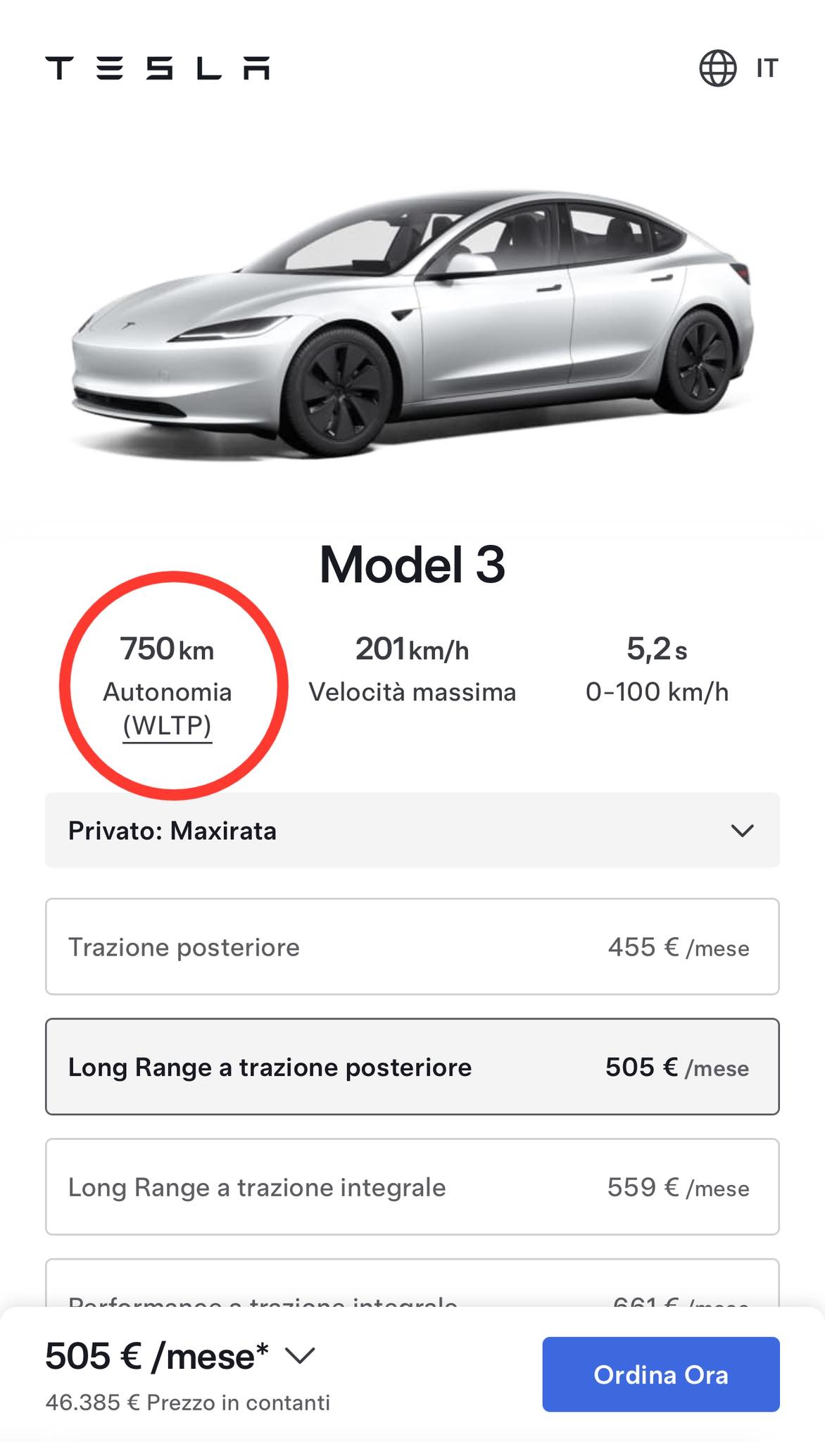 - Model 3 Long Range RWD: fino a 750 km WLTP, un valore da primato assoluto nel segmento