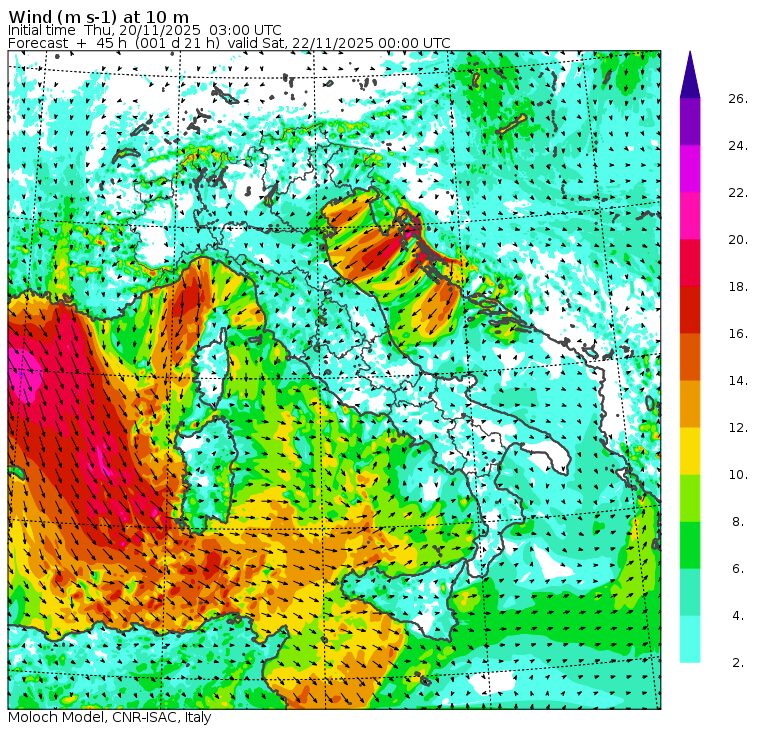 Impressionante la mappa dei venti, sempre del modello MOLOCH, per la notte tra venerdì e sabato: l’Italia sarà in balia delle gelide correnti del Vortice Polare, con un maestrale impetuoso che soffierà dalla Valle del Rodano fino alla Sardegna, ma anche una forte bora sul medio e alto Adriatico e la tramontana scura in Liguria. E’ il preludio di un sabato glaciale: sarà la giornata più fredda e nevosa di questo peggioramento, e ovviamente di questo mese di novembre e sicuramente di tutti i mesi di novembre degli ultimi decenni sull’Italia!