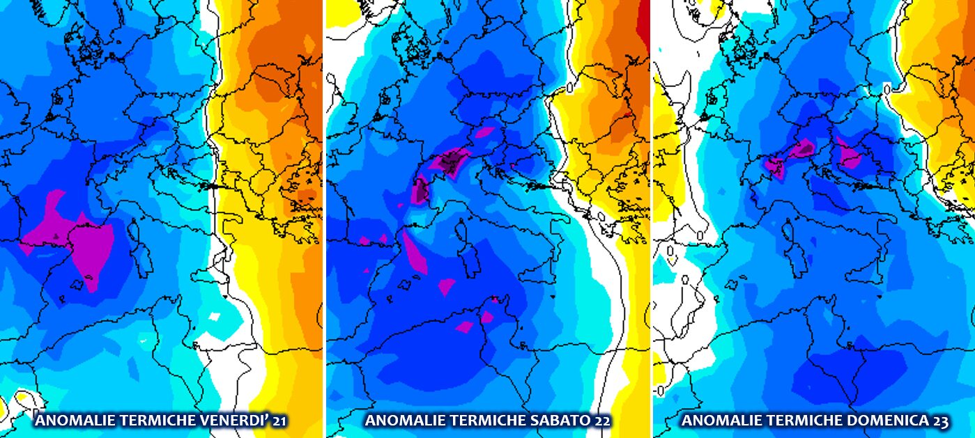 Ma l’elemento più importante riguardo l’eccezionalità di questa ondata di freddo e neve, è il rapporto con la media del periodo. Non siamo, infatti, a gennaio o febbraio quando uno scenario del genere sarebbe assolutamente normale nel contesto tipicamente invernale di quel periodo dell’anno. Siamo ancora a metà novembre, in pieno autunno, e le temperature scenderanno diffusamente 10°C sotto le medie del periodo nel nostro Paese e su gran parte d’Europa e del Mediterraneo, con possibili record di freddo mensili. E’ questa l’eccezionalità del freddo e delle nevicate dei prossimi giorni: il momento in cui si verificano, assolutamente fuori stagione. Le mappe con le anomalie termiche del modello statunitense GFS lo dimostrano pienamente: