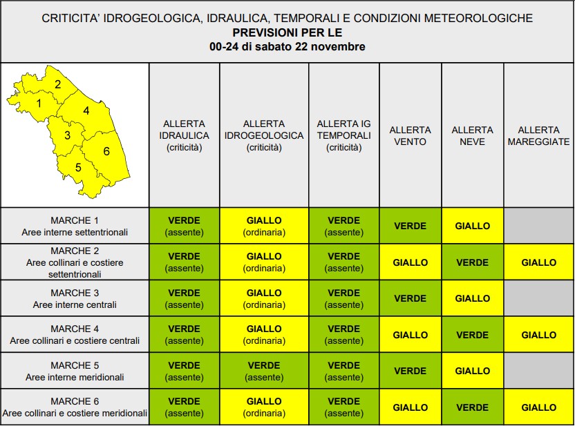 La Protezione Civile regionale delle Marche ha emesso un‘allerta meteo gialla per frane e piene dei corsi minori, vento, neve e mareggiate per la giornata di domani, sabato 22 novembre. “Nella giornata di sabato, la formazione di un minimo depressionario, nel basso Adriatico, consentirà l’ingresso di aria fredda nella regione, con precipitazioni diffuse e persistenti, a carattere nevoso al di sopra dei 300 metri e intensa ventilazione da nord-est lungo la costa, con conseguente stato del mare molto mosso. Le precipitazioni saranno diffuse, anche a carattere di rovescio, a cominciare dal settore settentrionale ed in veloce espansione al resto della regione. Dal pomeriggio i fenomeni tenderanno ad esaurirsi nella porzione settentrionale del territorio e saranno più insistenti in quella meridionale”, si legge nel bollettino di allerta.