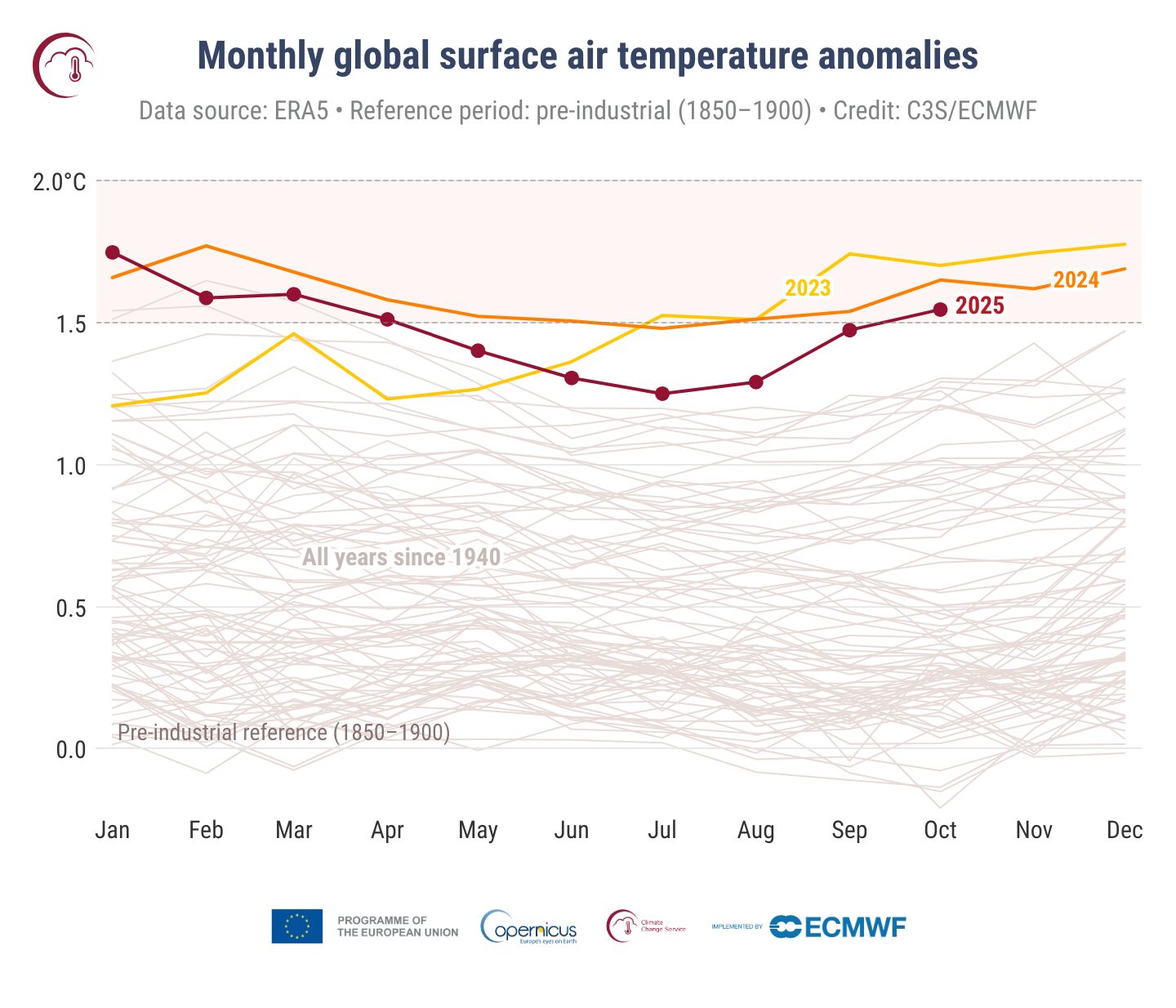 Rispetto all’epoca preindustriale (1850-1900), ottobre 2025 ha segnato un +1,55°C: è il primo mese dal aprile 2025 a superare nuovamente la soglia di +1,5°C, valore chiave indicato dall’Accordo di Parigi.