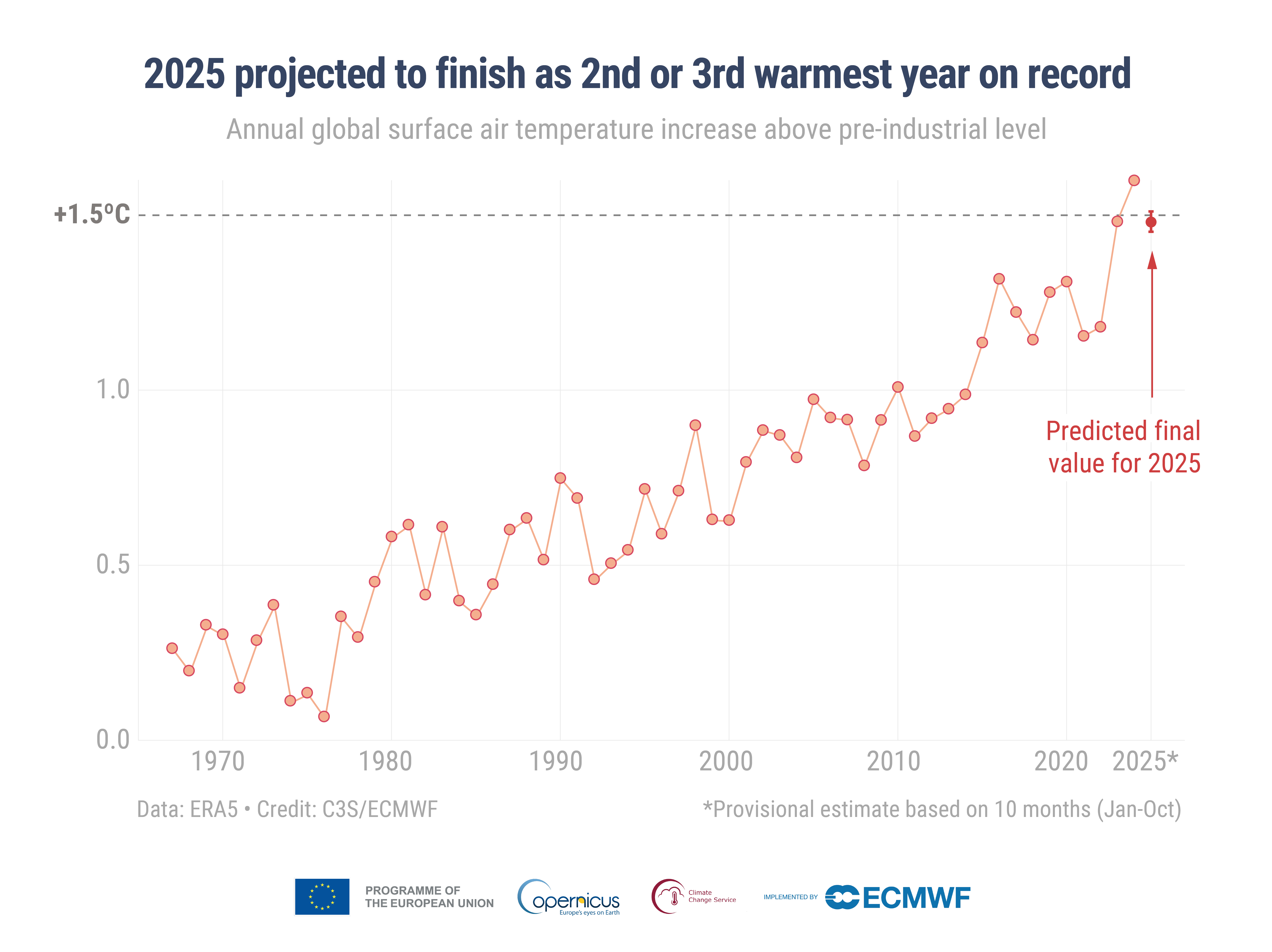 Il periodo di 12 mesi da novembre 2024 a ottobre 2025 mostra una temperatura media globale superiore di 1,5°C rispetto ai livelli preindustriali. Con queste condizioni, il 2025 è destinato quasi certamente a classificarsi tra il secondo e il terzo anno più caldo mai registrato, vicino al 2023 e subito sotto il 2024, attualmente l’anno più caldo in assoluto.